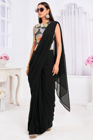 Delicate Black Color Georgette Fabric Ready To Wear Ruffle Saree