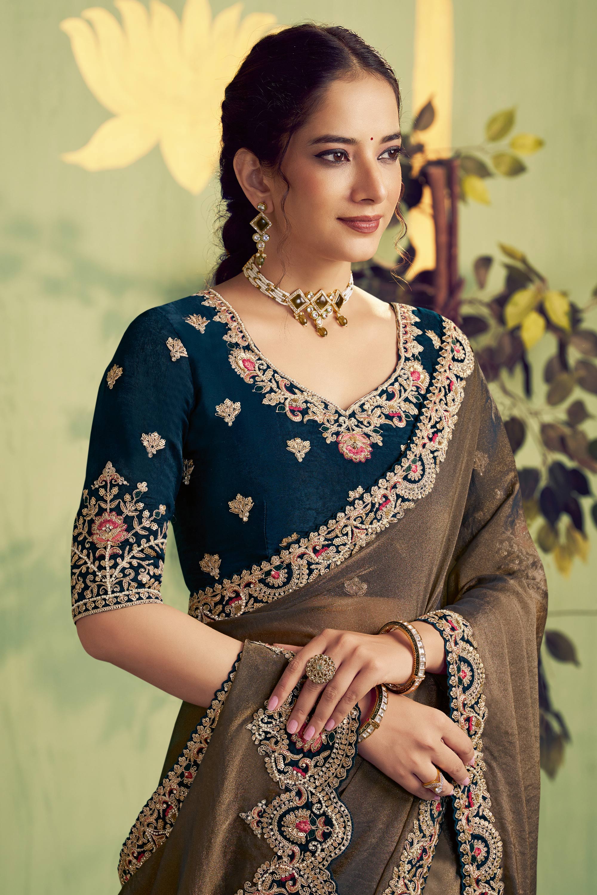 Organza Satin Border Work Teal Wedding Wear Saree