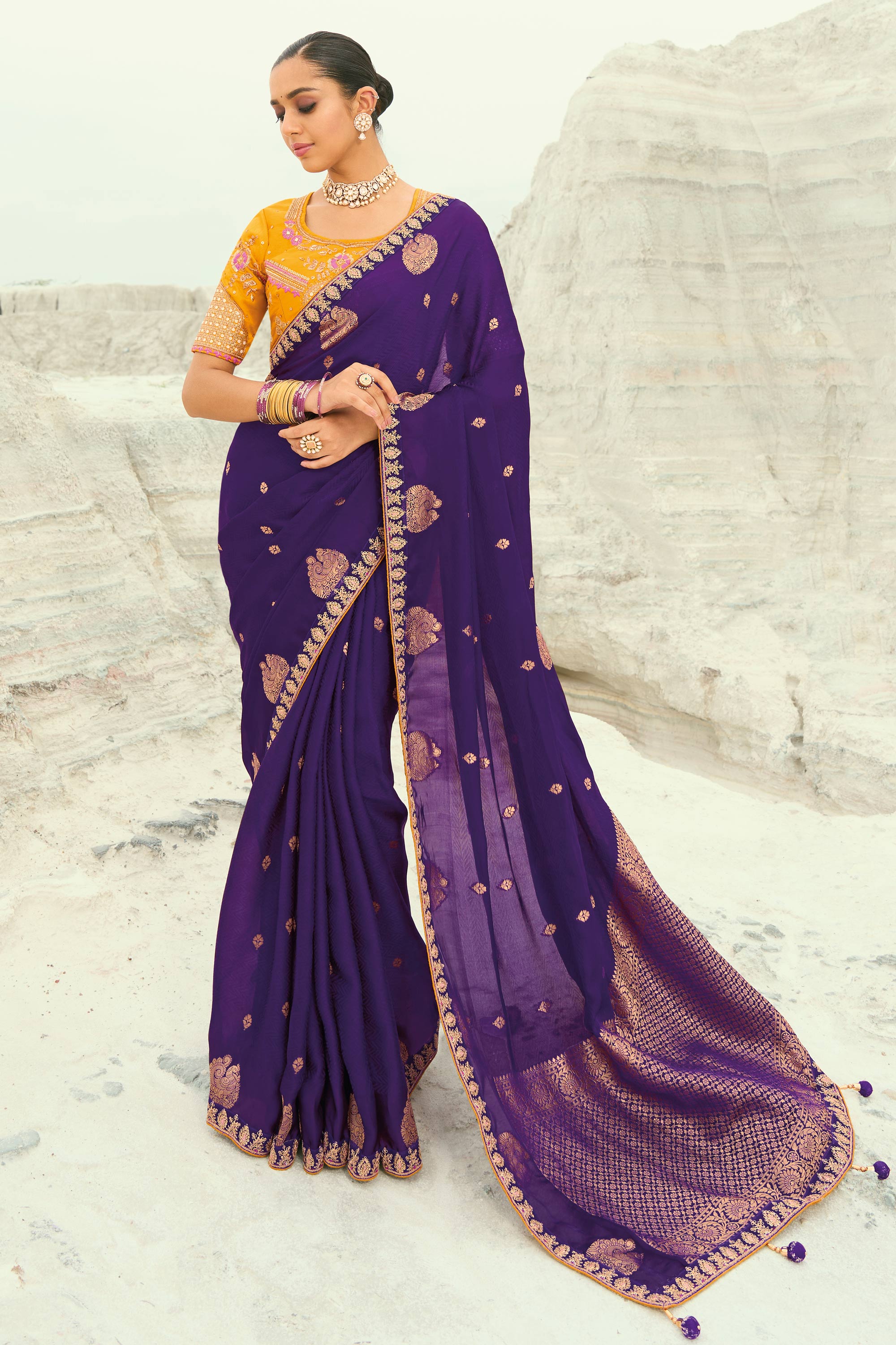 Purple Wedding Wear Viscose Border Work Saree With Embroidered Blouse