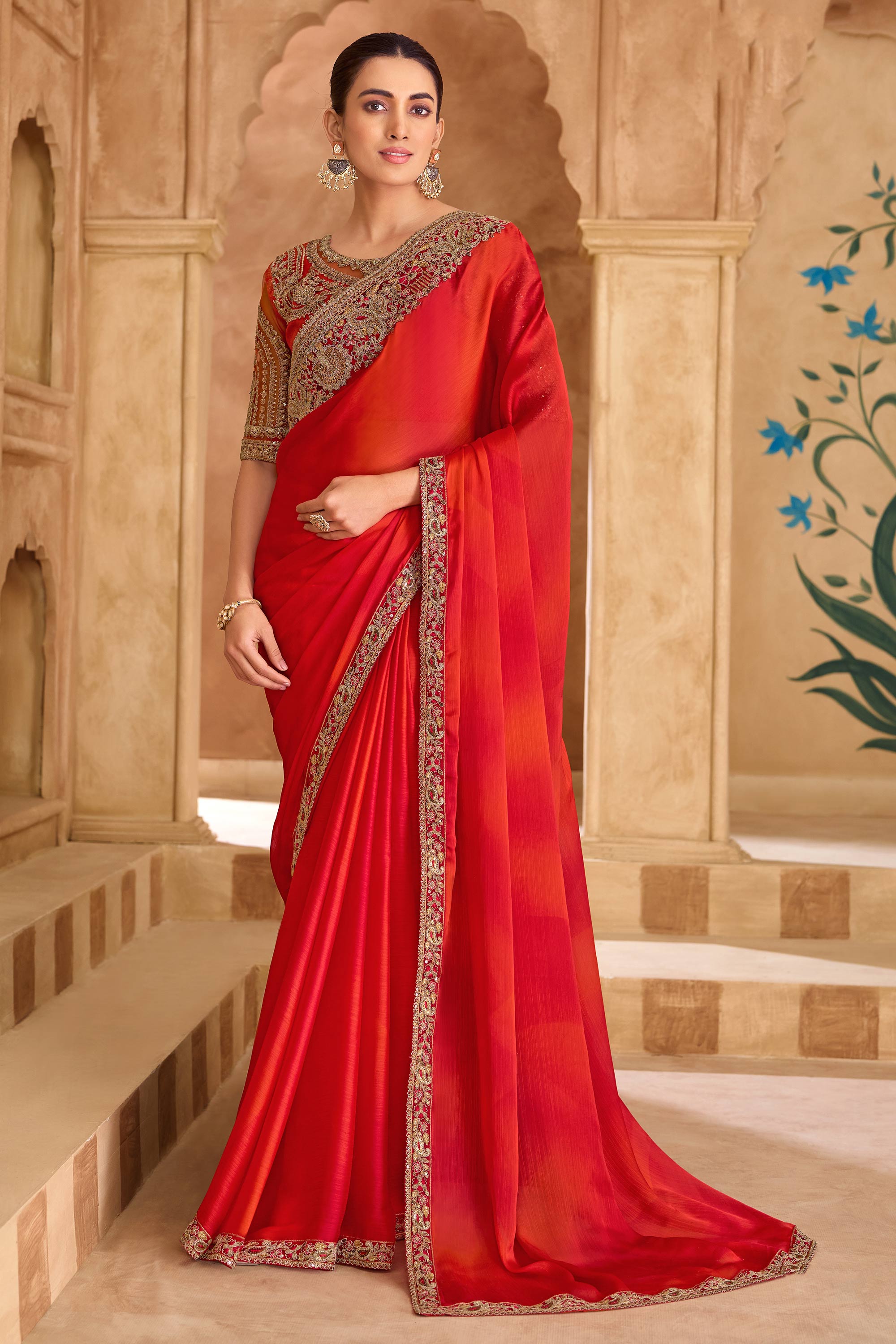 Red Festive Wear Lace Border Work Chiffon Designer Saree