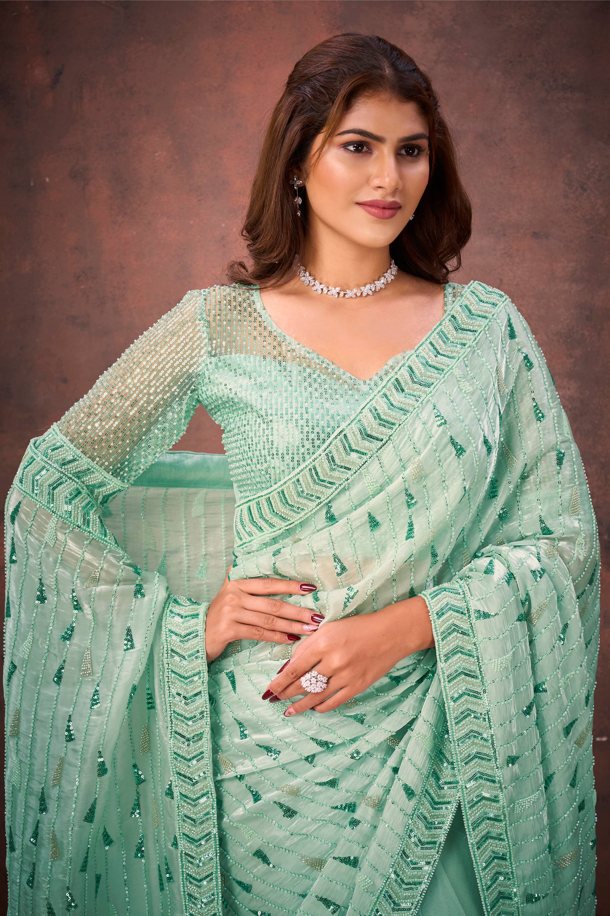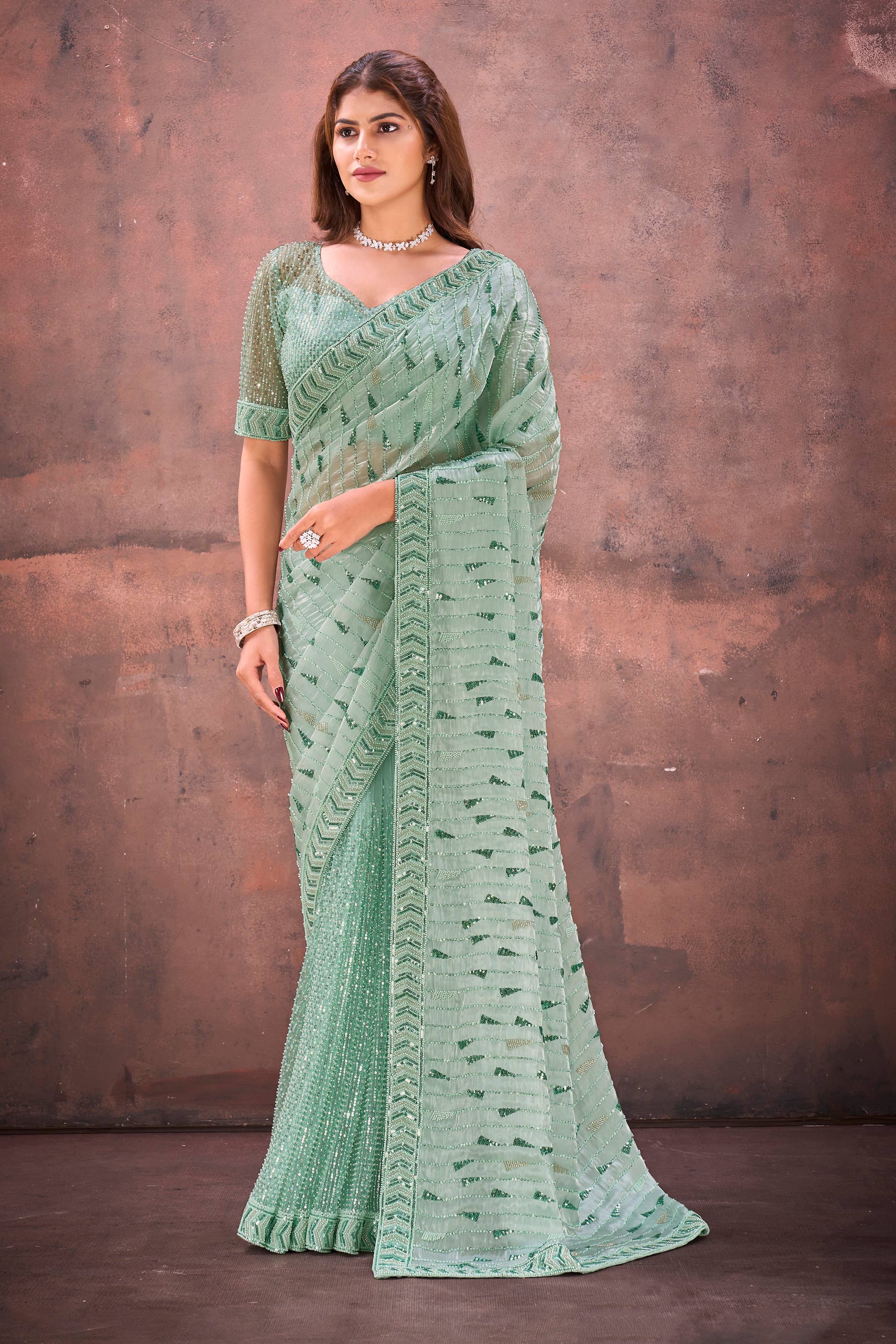 Sequins Work Net Fabric Sea Green Readymade Saree