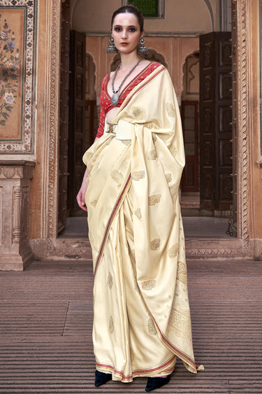 Weaving Work Beige Color Aristocratic Satin Silk Fabric Saree