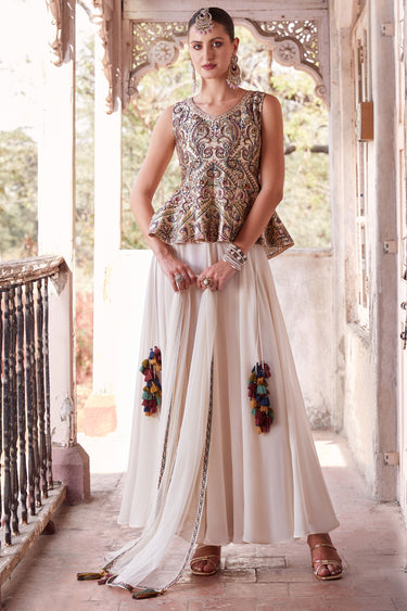 Beige Color Satin Fabric Enticing Readymade Sharara Suit