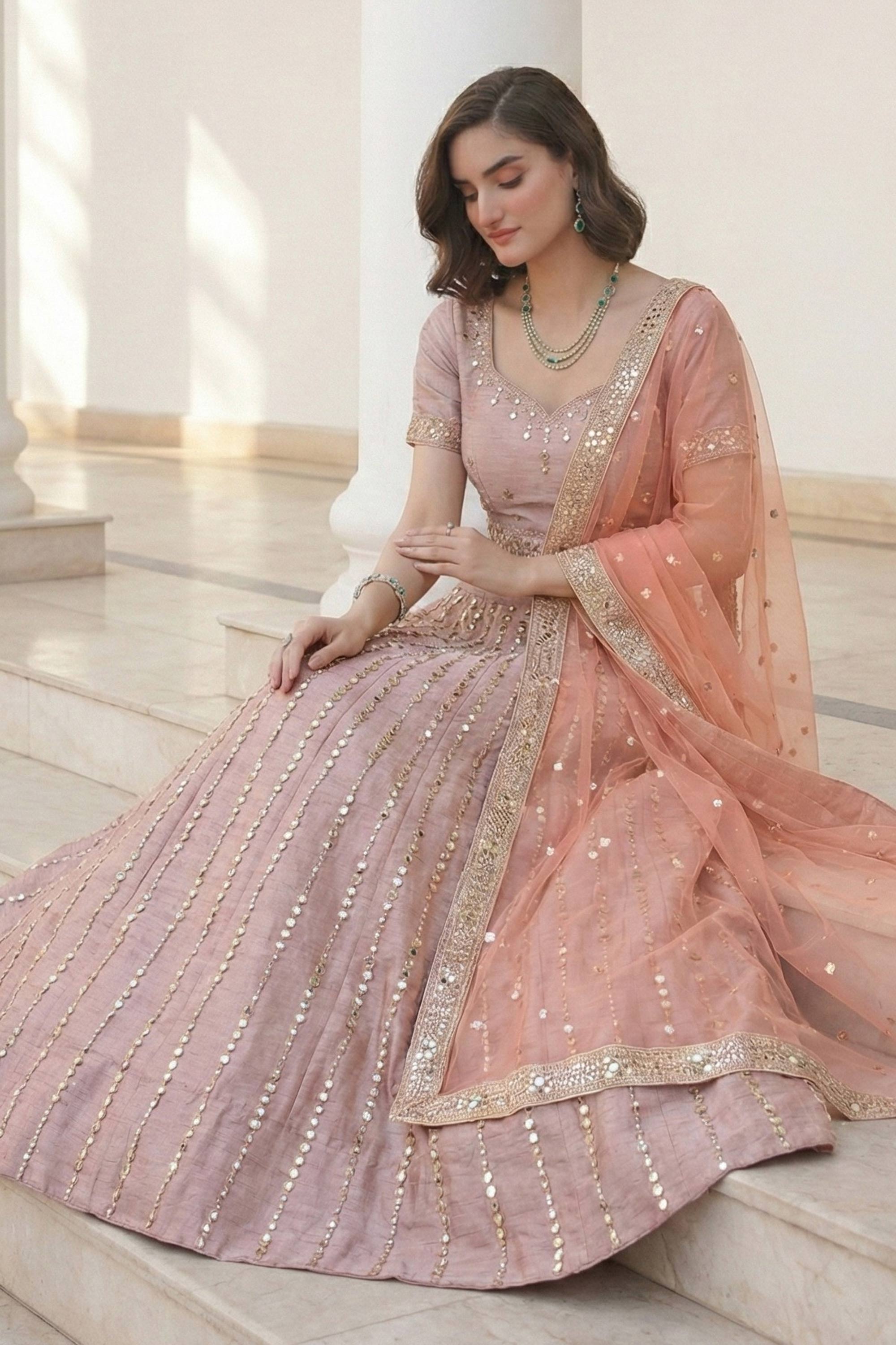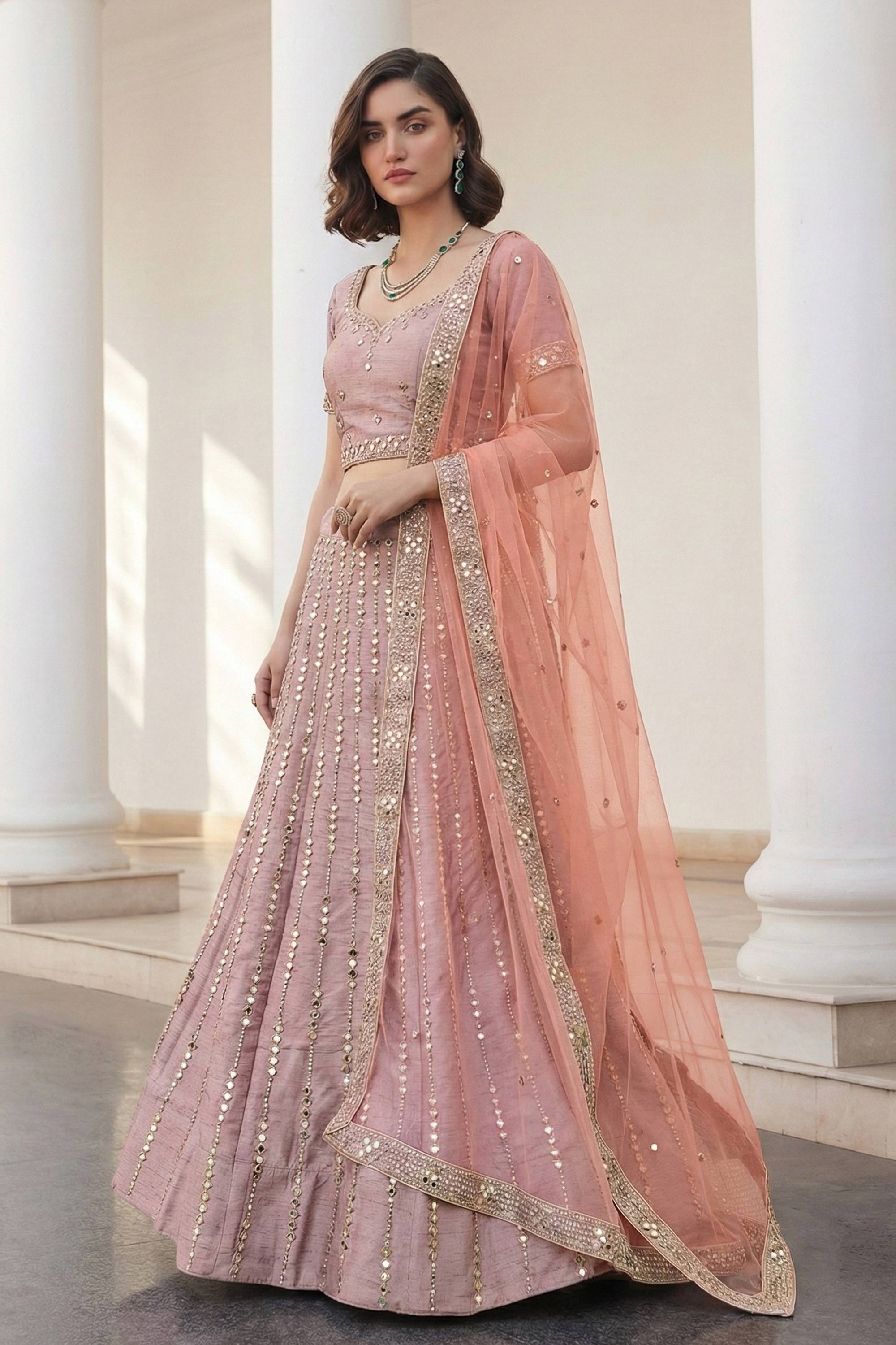 Silk Mirror Work Pink Wedding Wear Lehenga Choli
