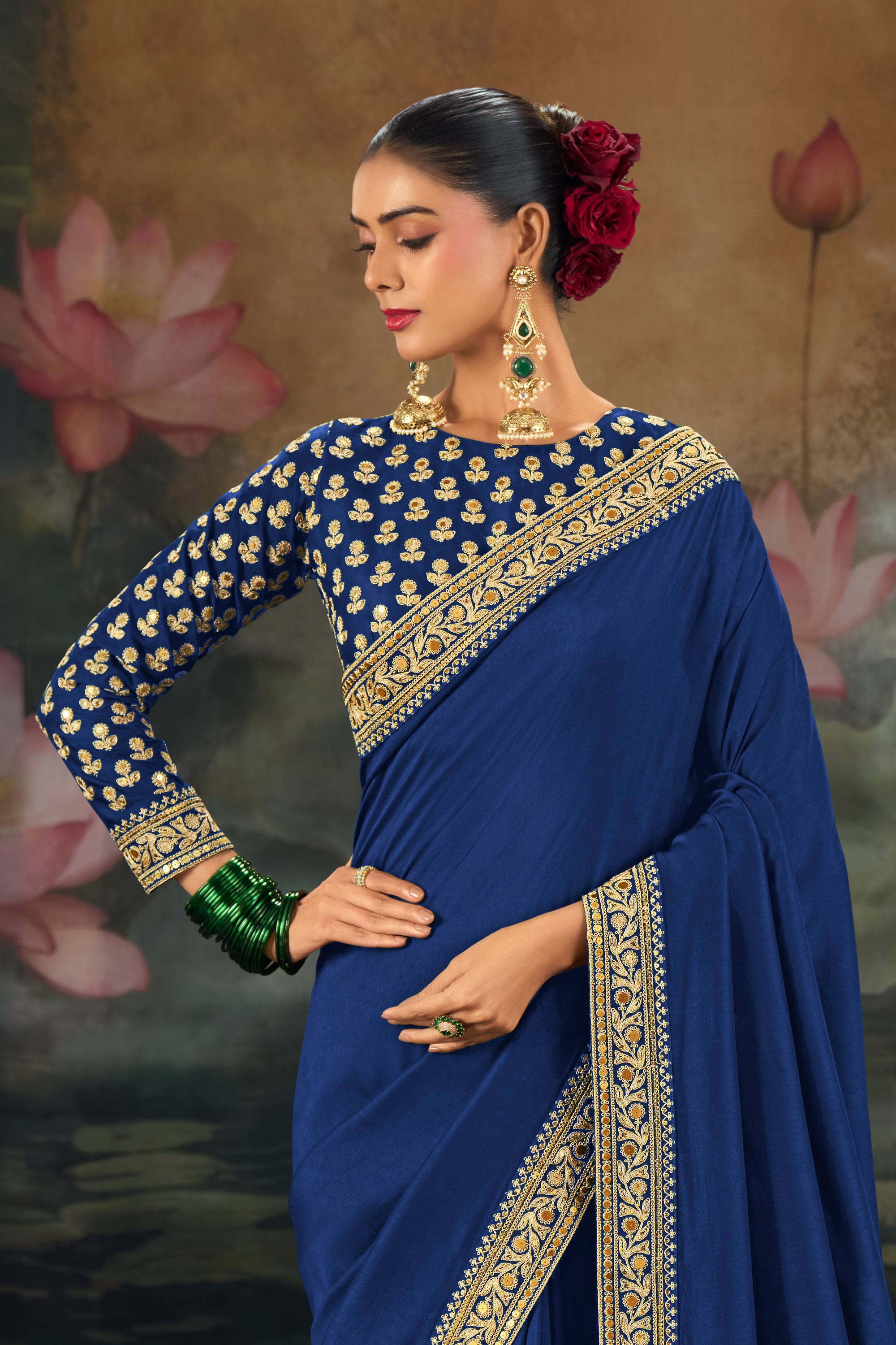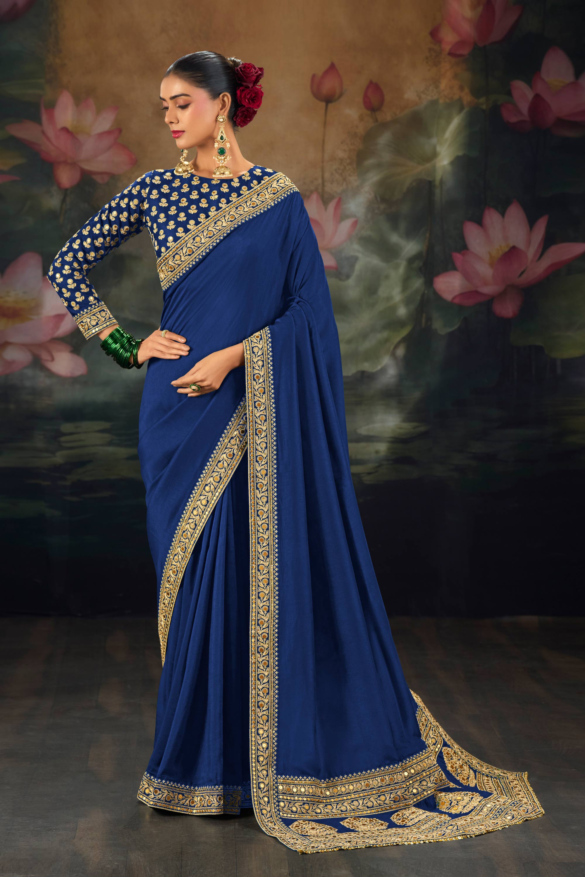 Embroidered Silk Navy Blue Sangeet Wear Saree