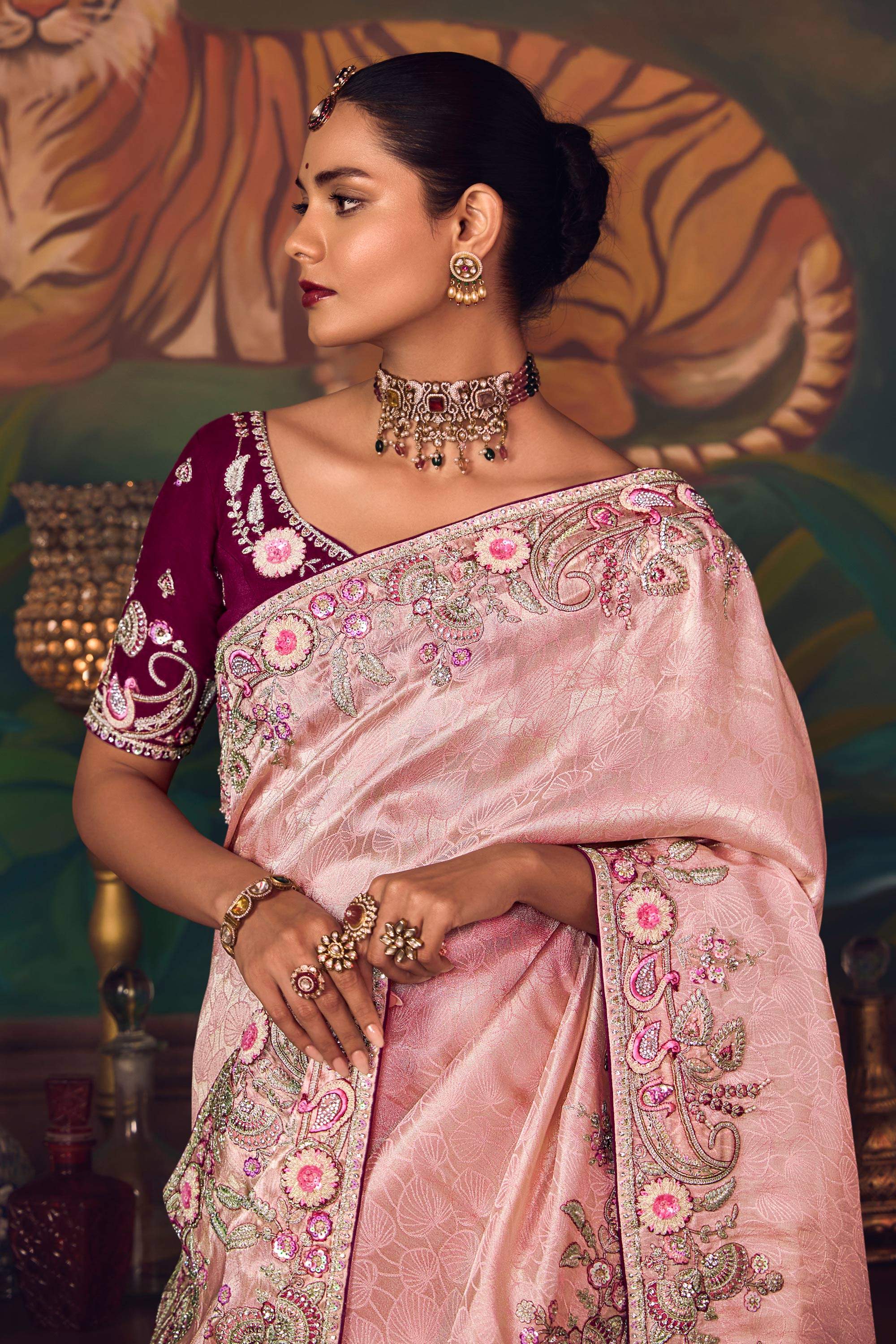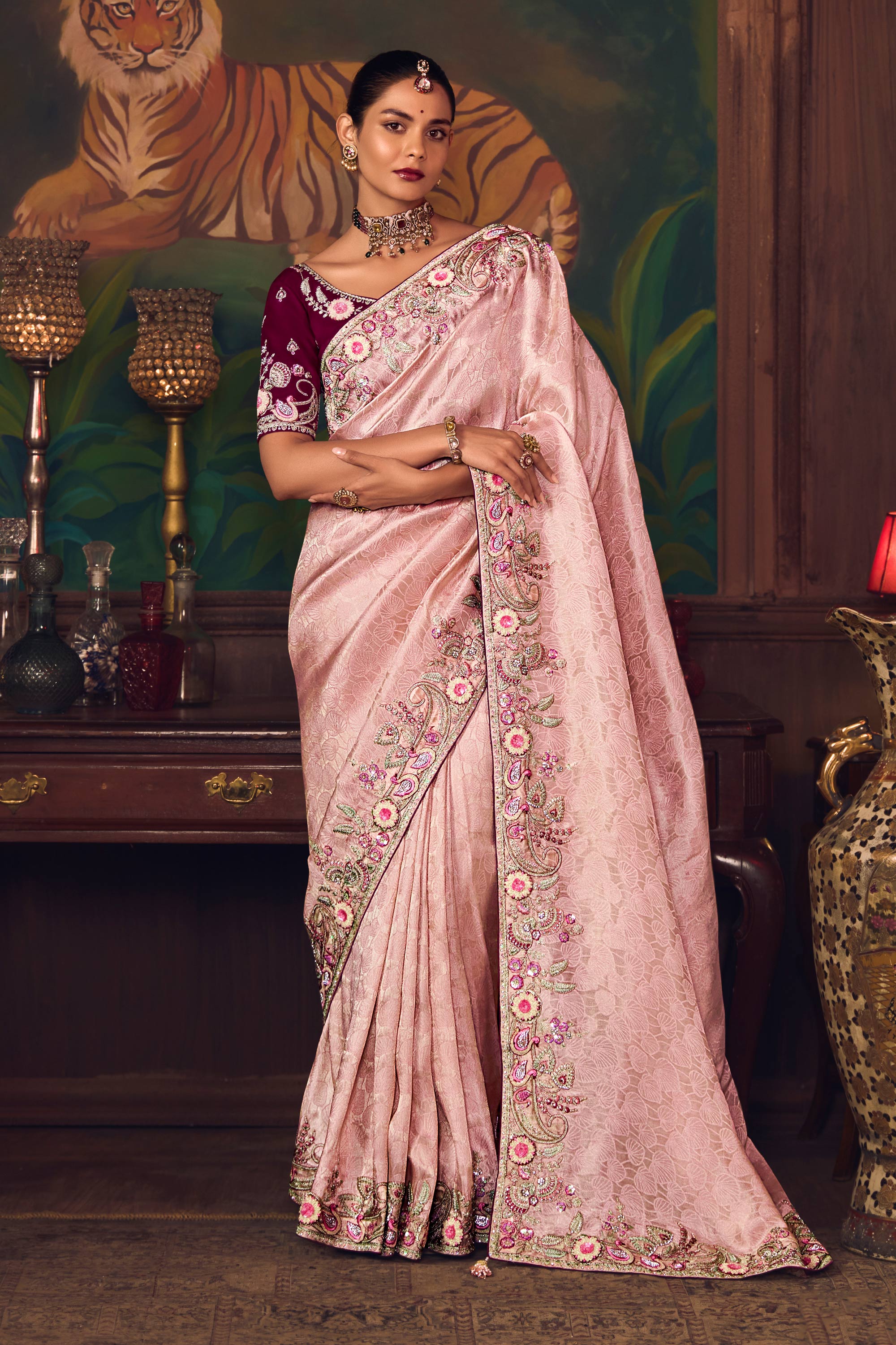 Enhance your ethnic collection with this graceful Heavy Border Work Wedding Bridal Silk Saree. Featuring luxurious silk fabric adorned with intricate border craftsmanship, this saree offers timeless beauty for weddings and celebrations. Accompanied by an unstitched blouse showcasing heavy detailing, you can create a tailored fit for added elegance. Designed for women who love a blend of tradition and luxury, this saree is perfect for making a bold yet refined statement. Treat yourself to unparalleled sophistication.