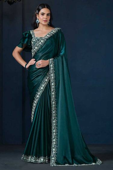 Teal Crepe Satin Silk Sequins Pure Handwork Saree With Unstitched Blouse