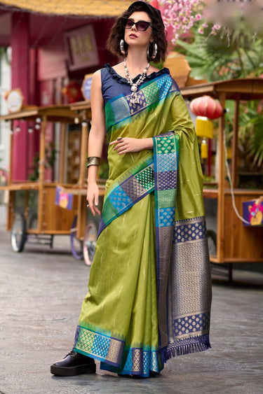 Weaving Work On Green Color Trendy Banarasi Silk Fabric Saree