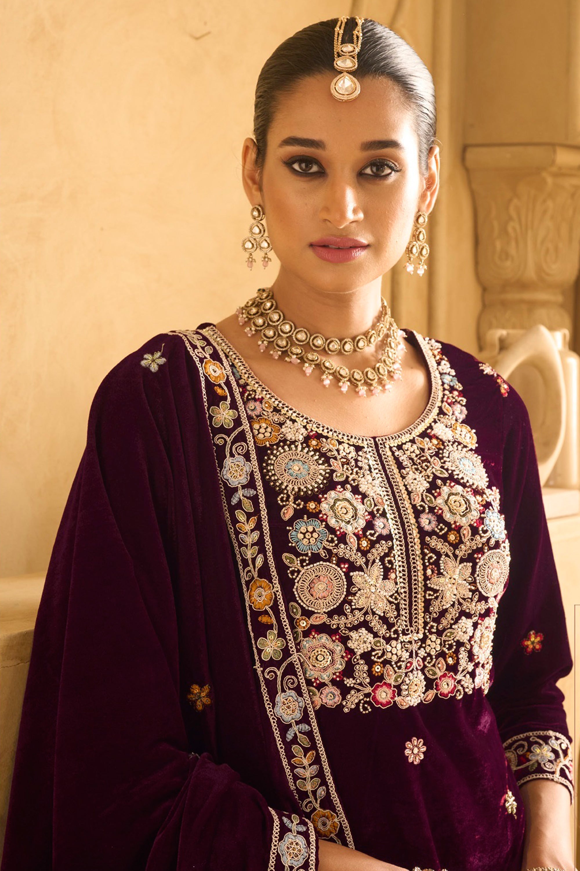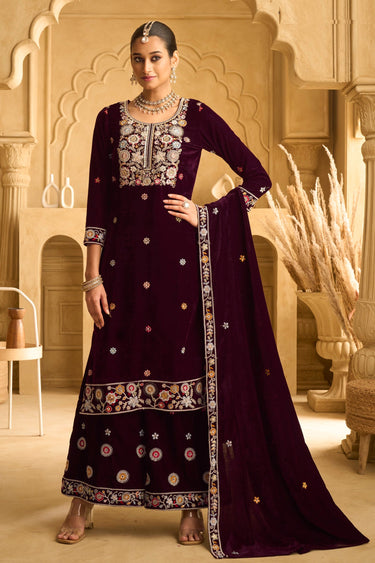 Wine Embroidered Velvet Palazzo Salwar Kameez