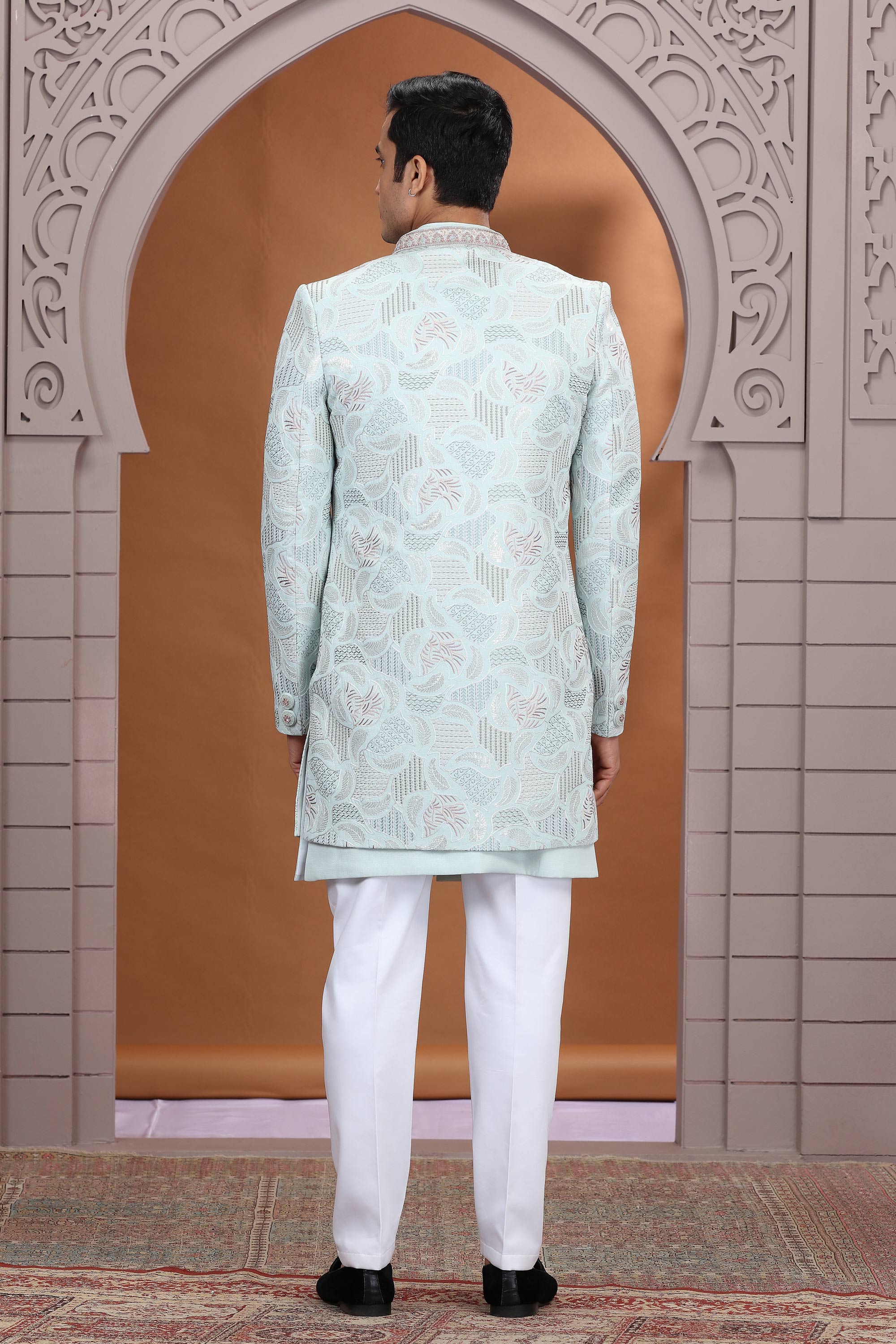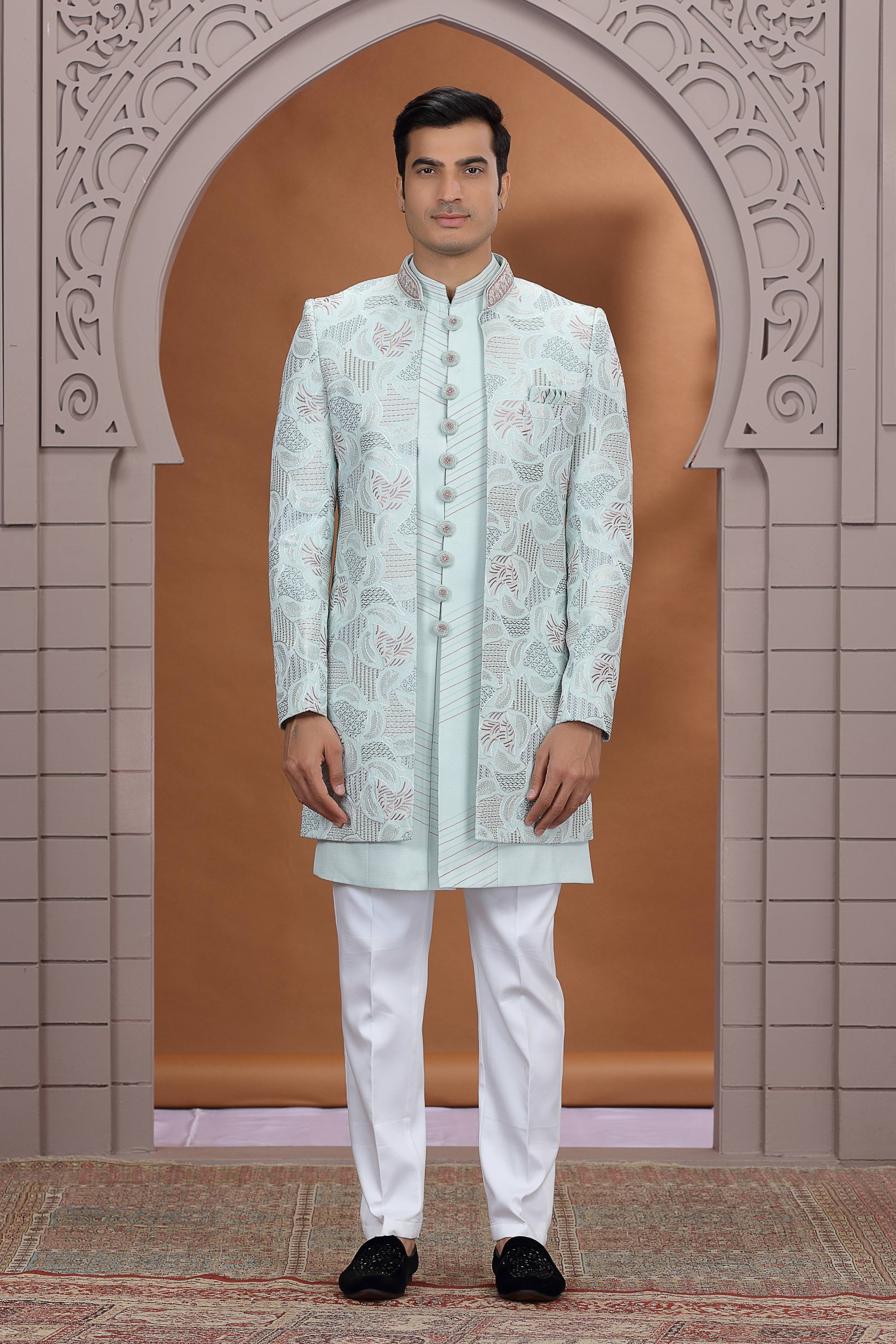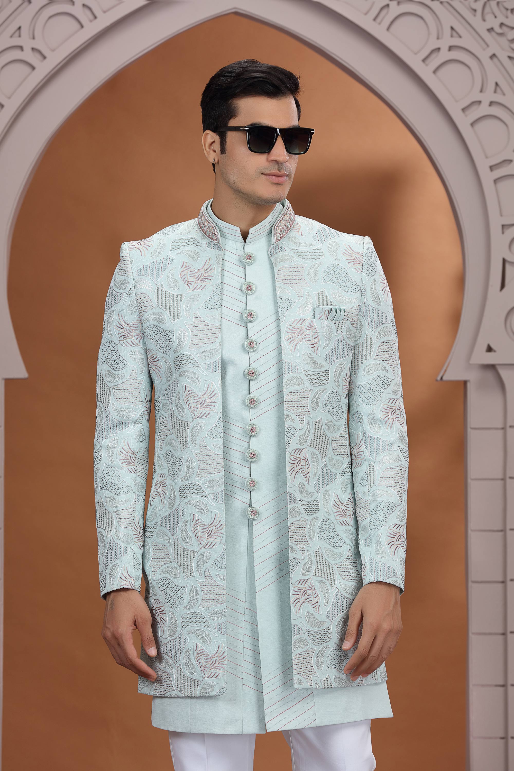 Embroidery Work Light Cyan Wedding Wear 3 Piece Indo Western For Men
