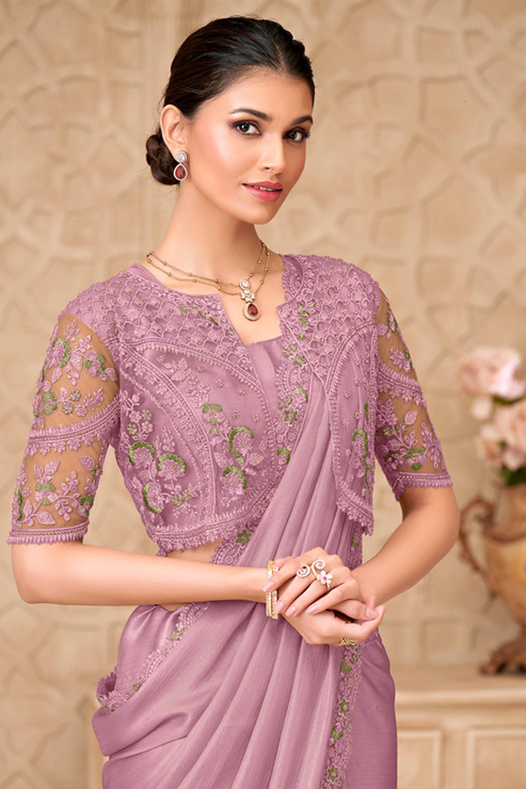 Georgette Satin Lace Border Work Purple Saree For Wedding Wear