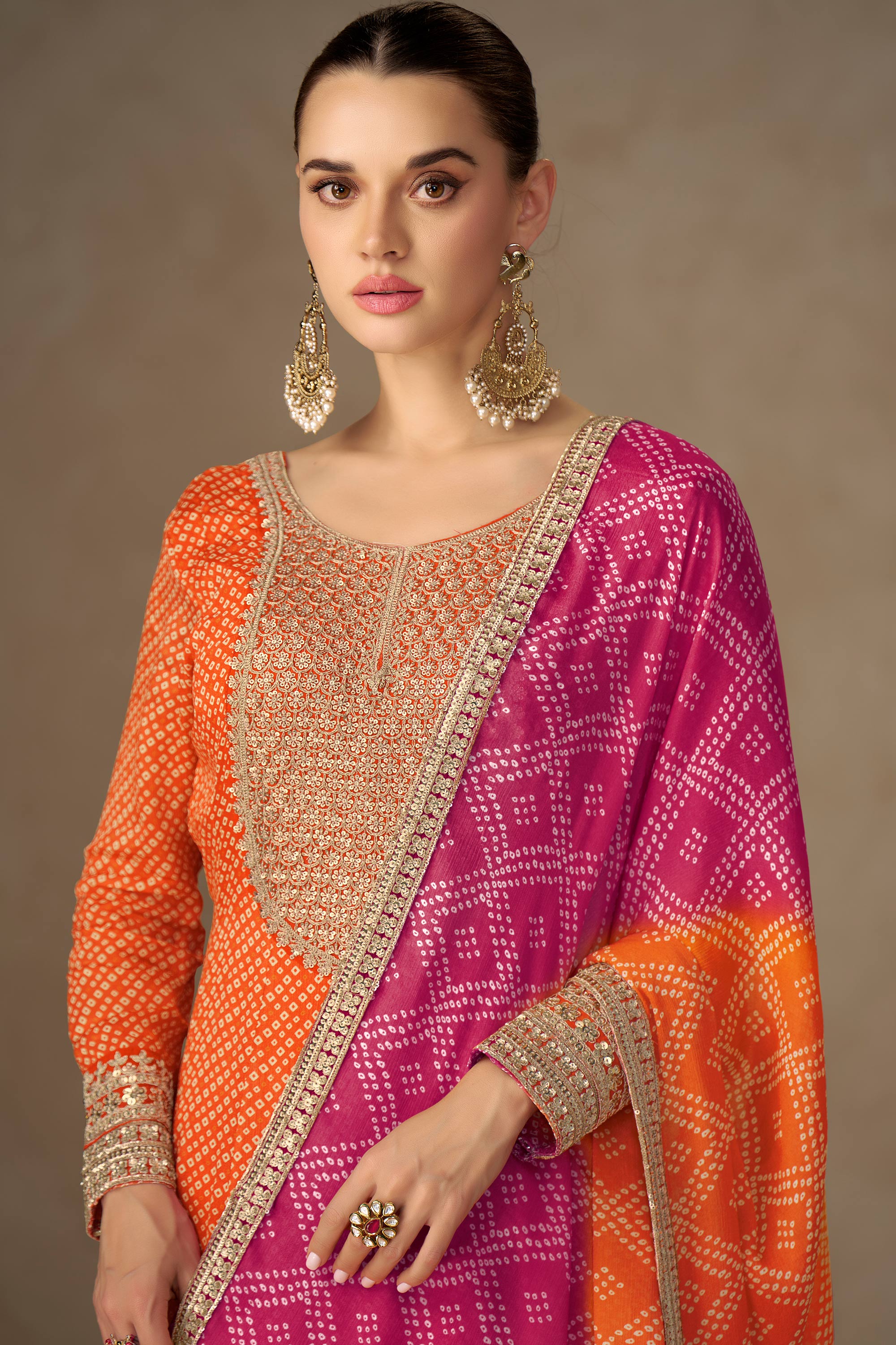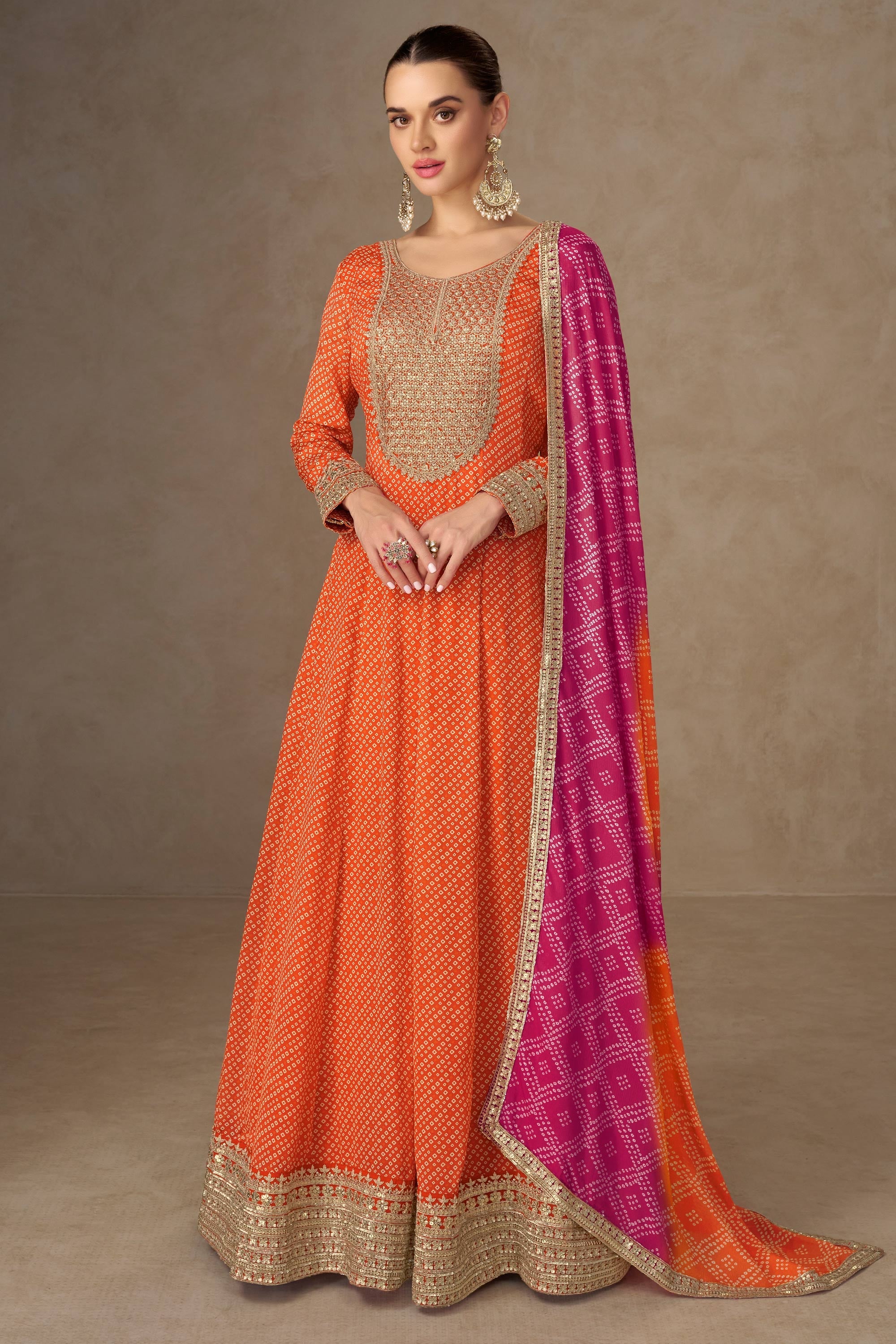 Orange Chinon Sequins Work Readymade Anarkali Salwar Kameez