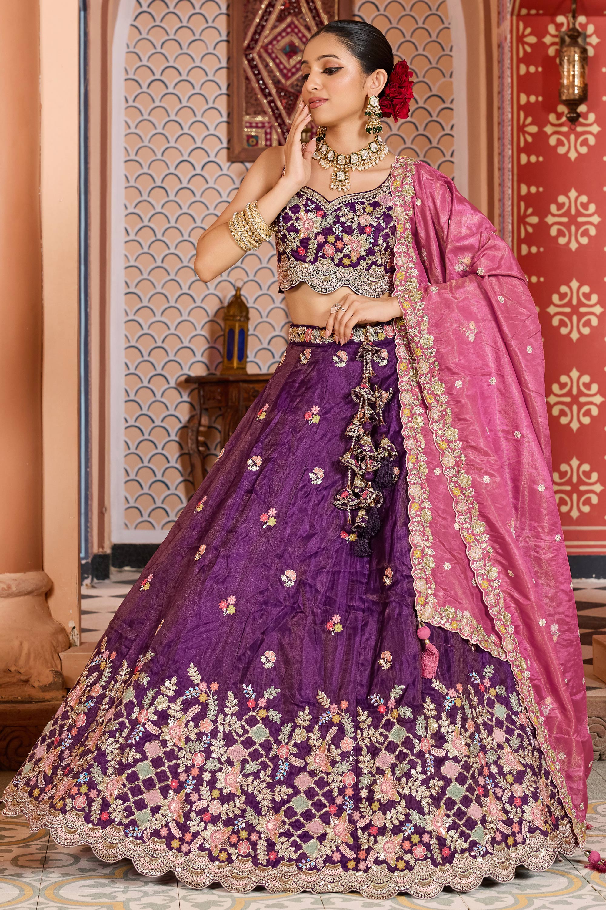 Tissue Fabric Wedding Wear Lehenga Choli In Purple Color