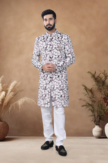 Introducing the Wedding Wear Readymade Glamorous Indo Western for Men. Designed for those who seek both style and tradition, this outfit is crafted from premium materials to ensure lasting comfort. Its elegant cuts and detailed embroidery bring out a timeless charm suitable for any wedding occasion. Available in a variety of sizes, this ensemble provides a perfect fit for every gentleman. Embrace sophistication and charm effortlessly with this magnificent outfit. Dry clean only for best results.