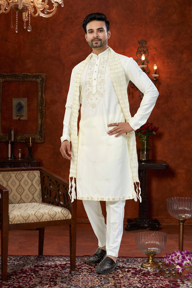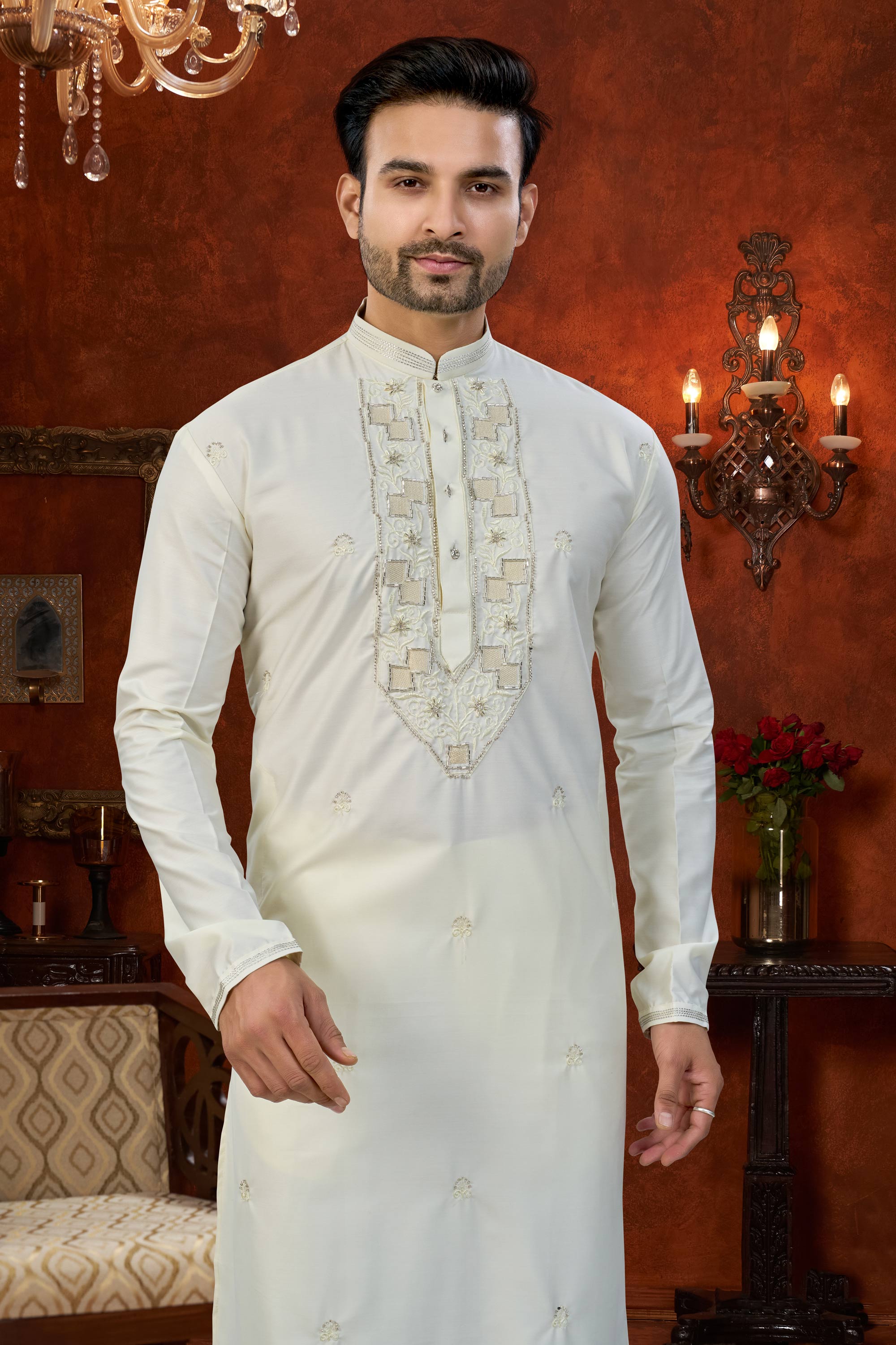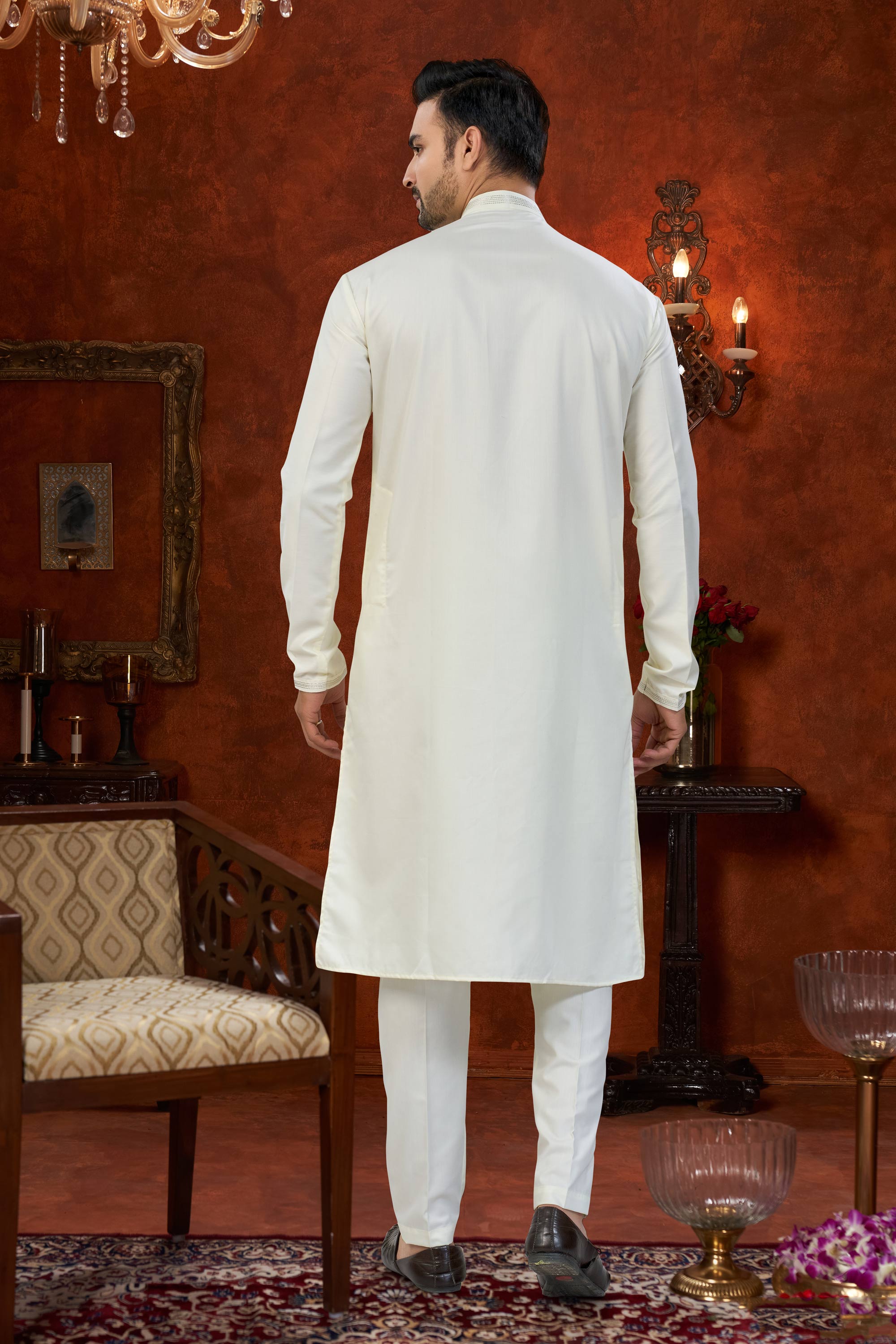 Art Silk Cream Wedding Wear Readymade Kurta Pyjama For Men