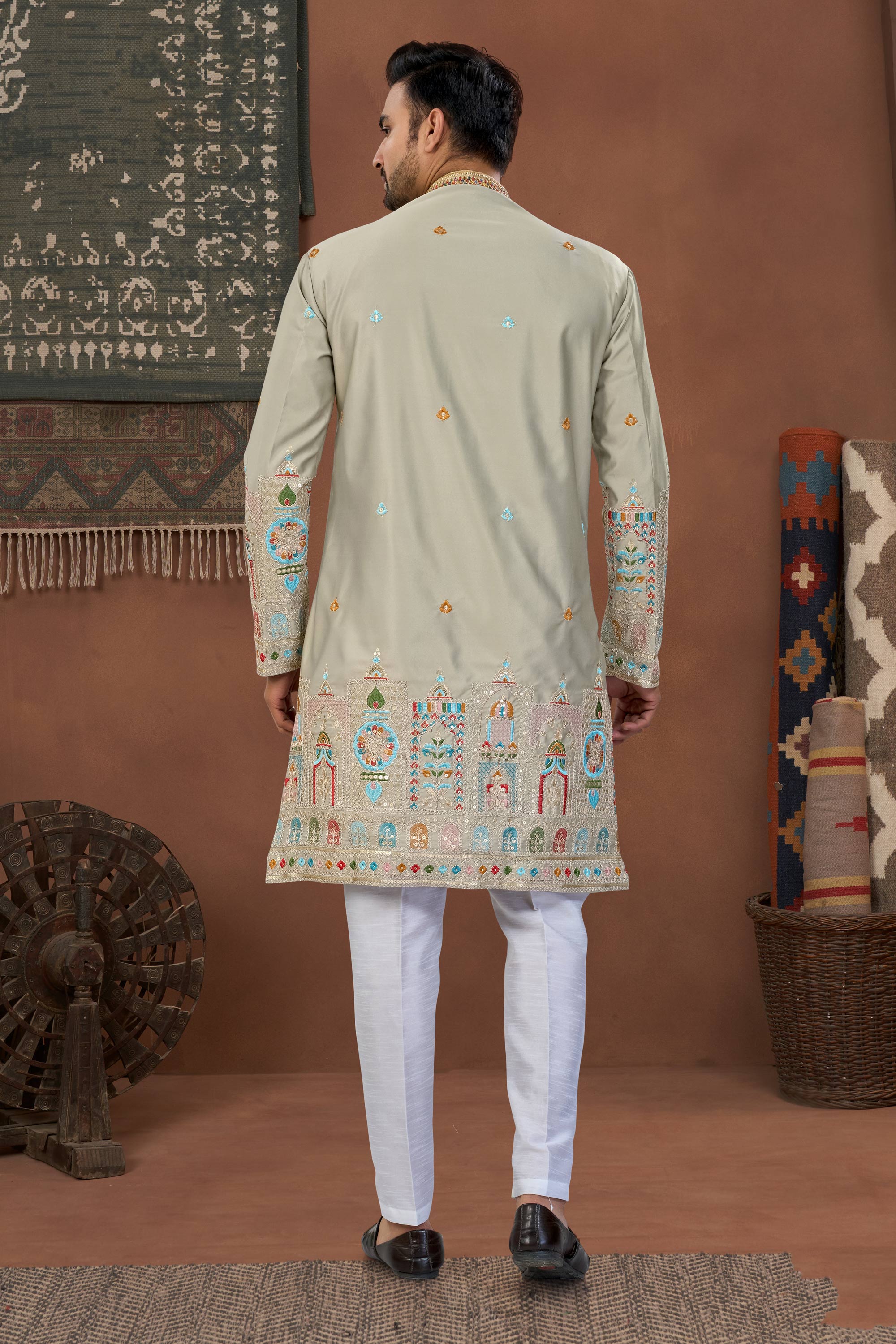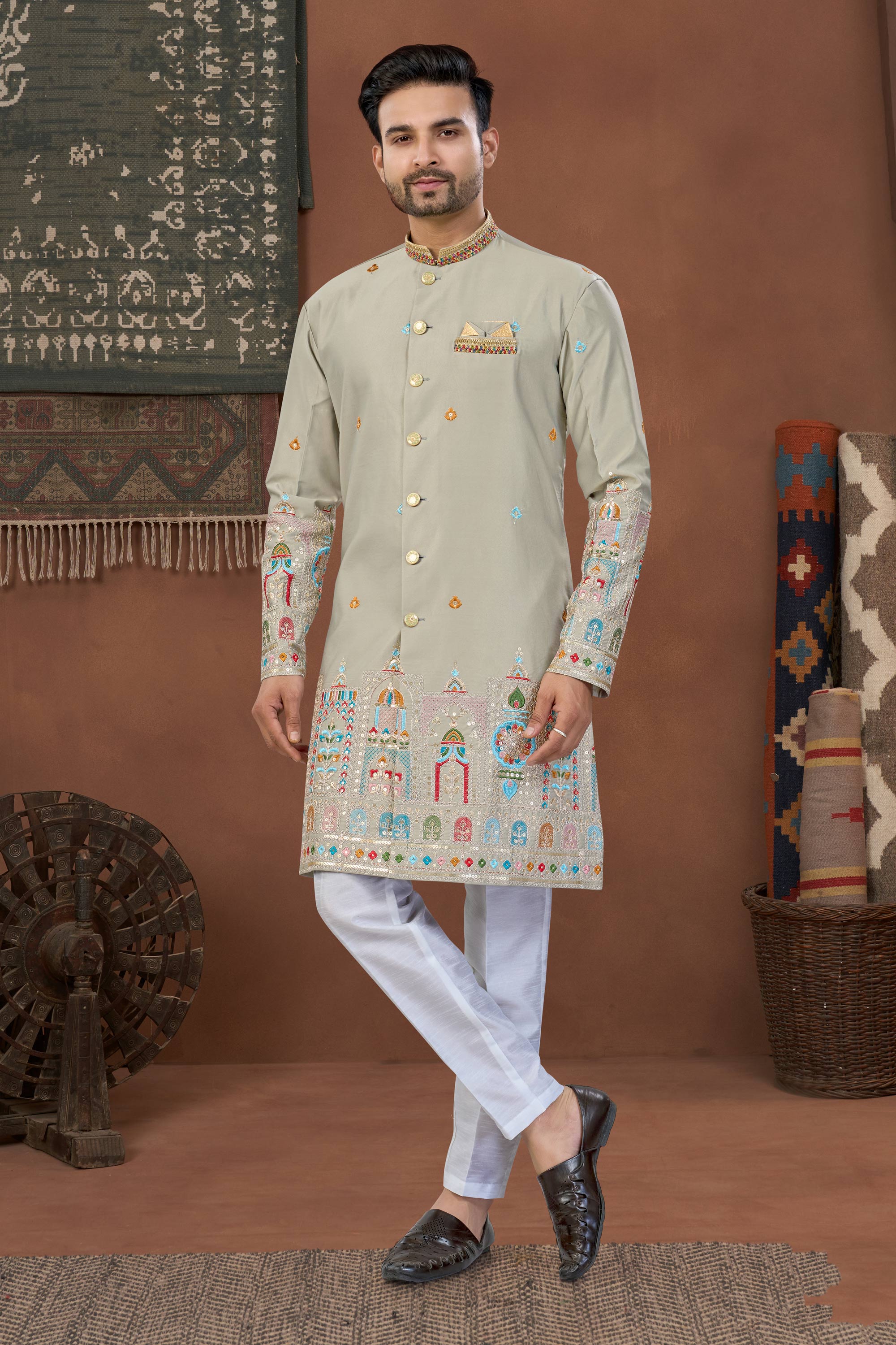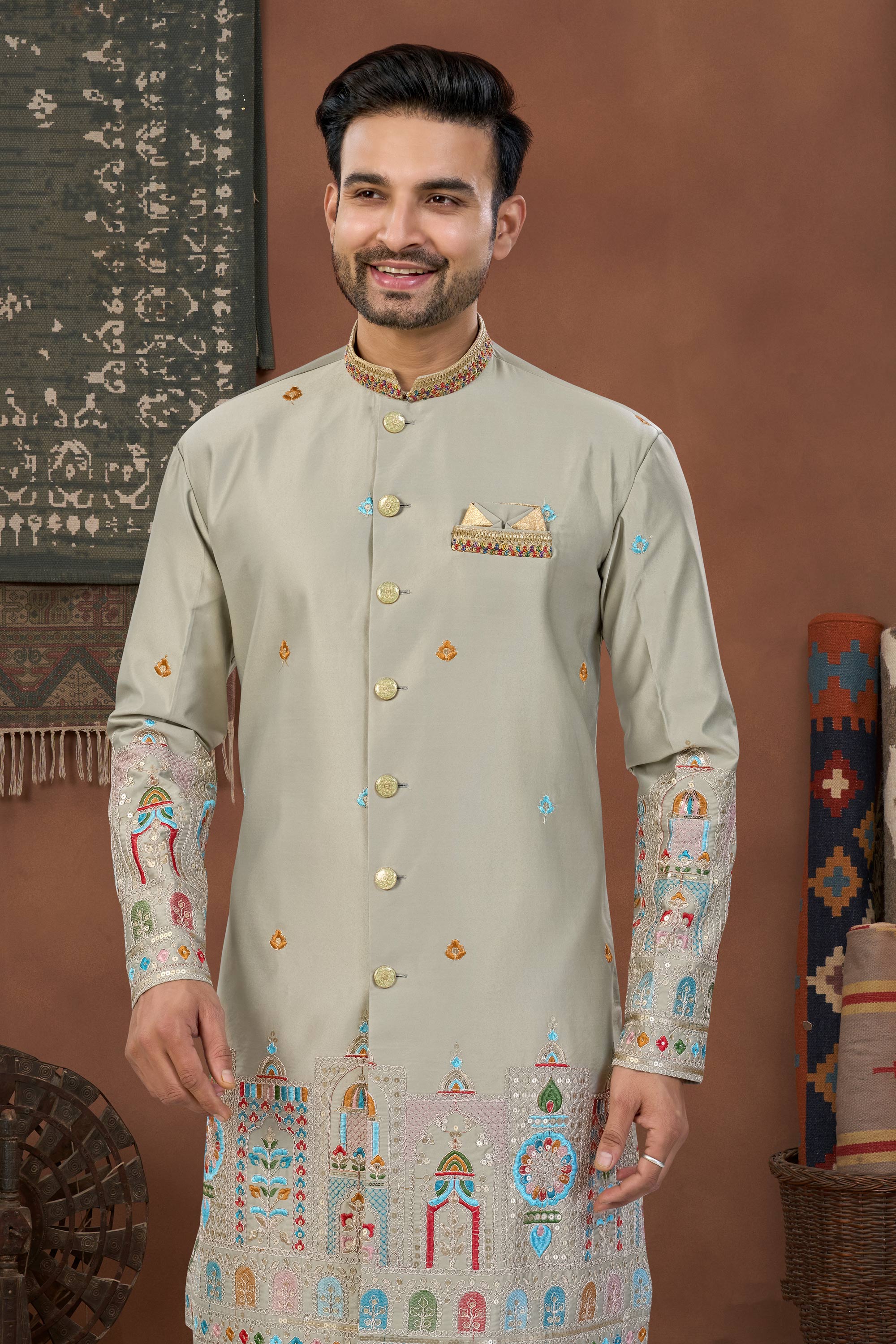 Art Silk Fabric Grey Wedding Wear Readymade Indo Western For Men