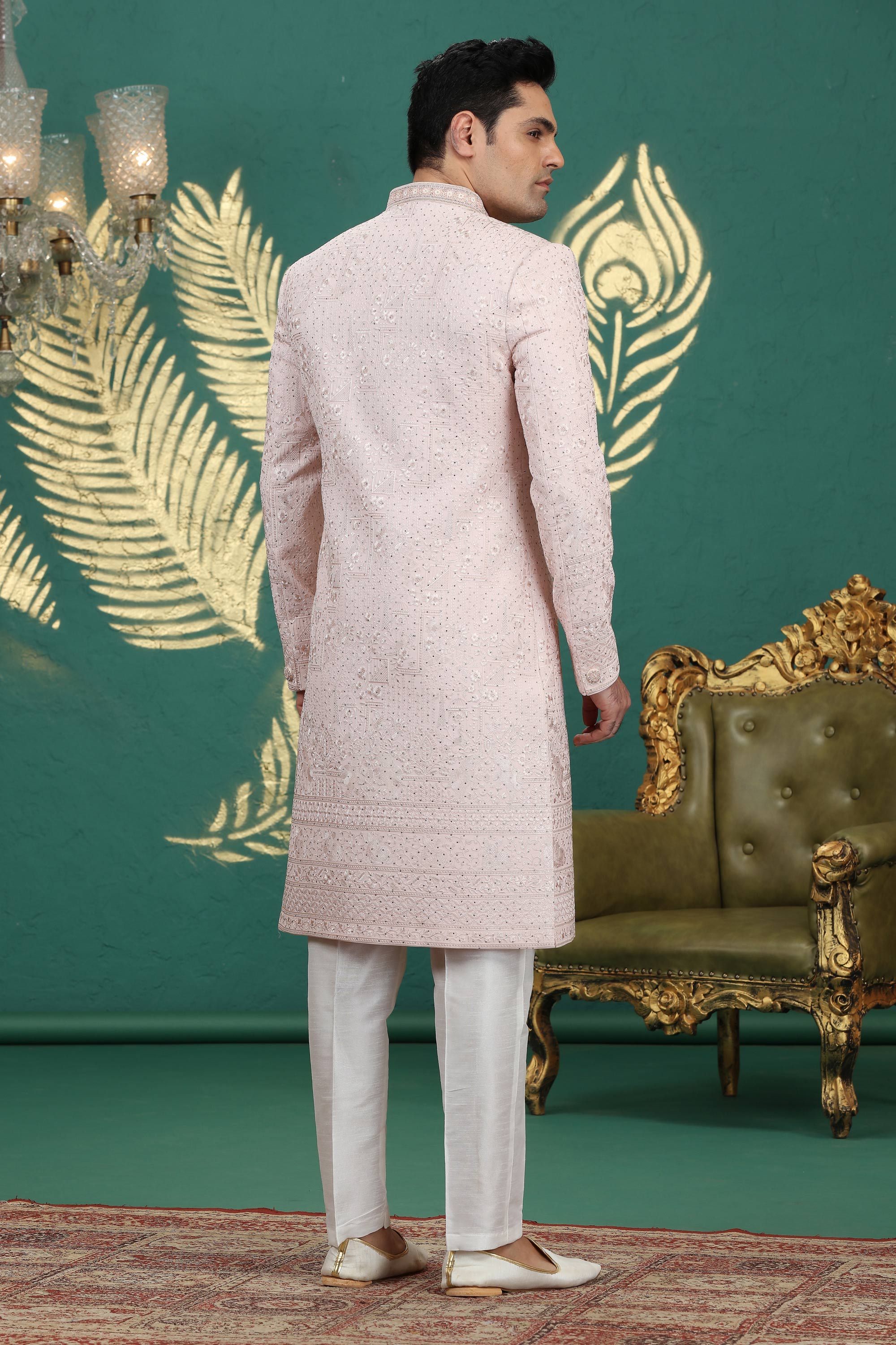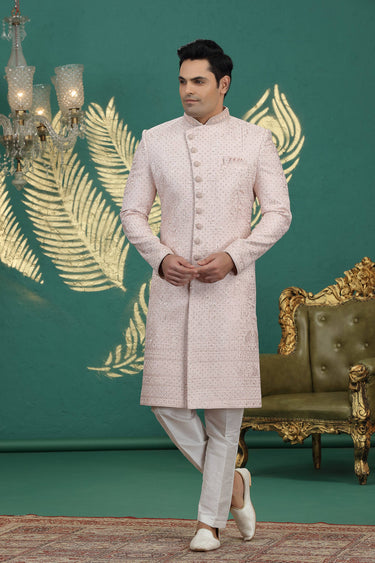 Beautiful Peach Wedding Wear Readymade Sherwani For Men In Art Silk