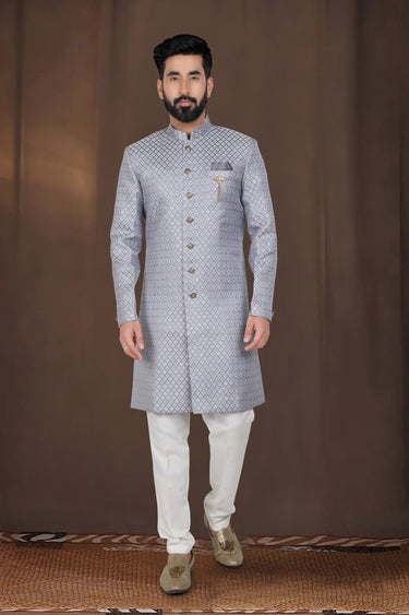 Grey Wedding Wear Readymade Glamorous Indo Western For Men In Jacquard Fabric