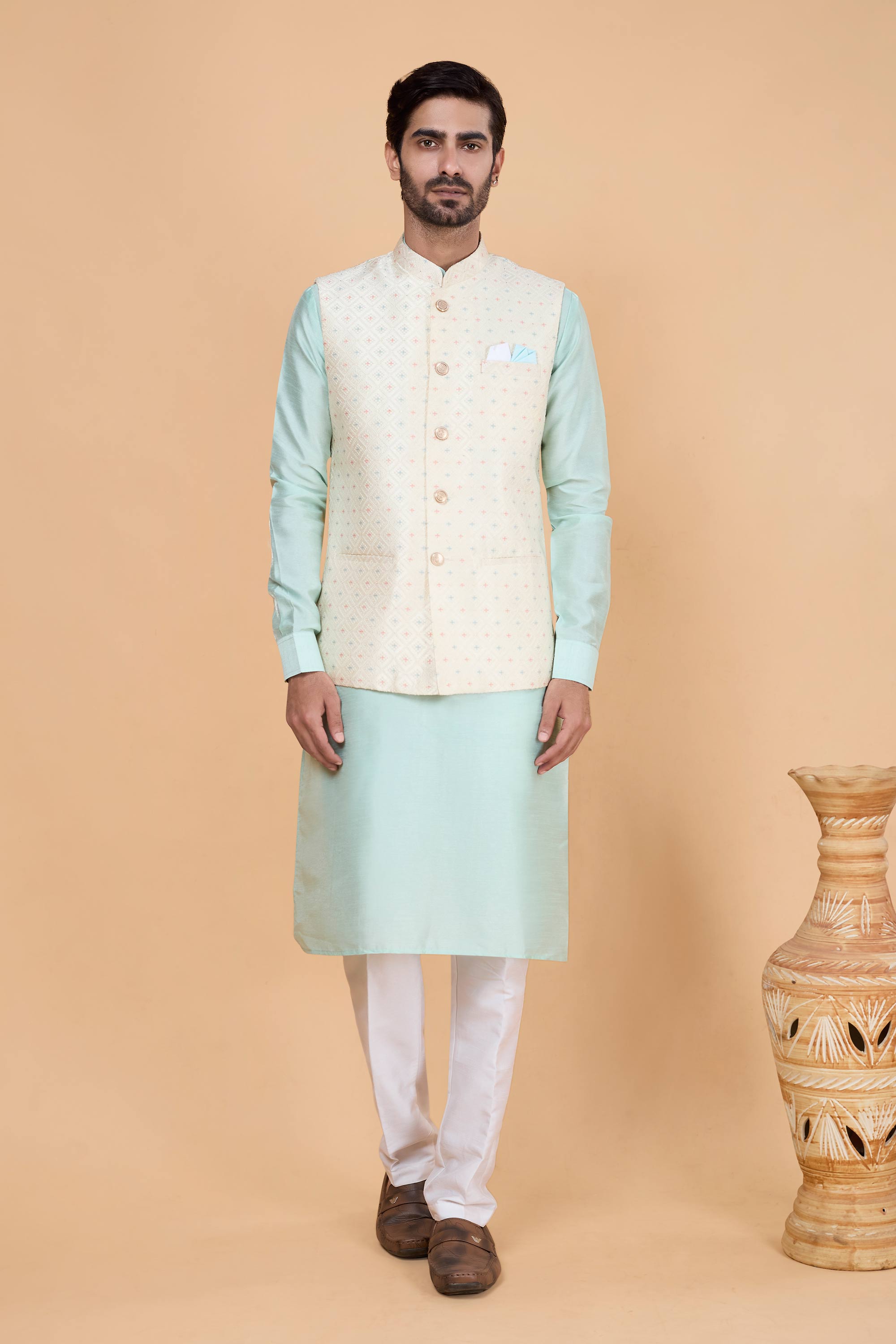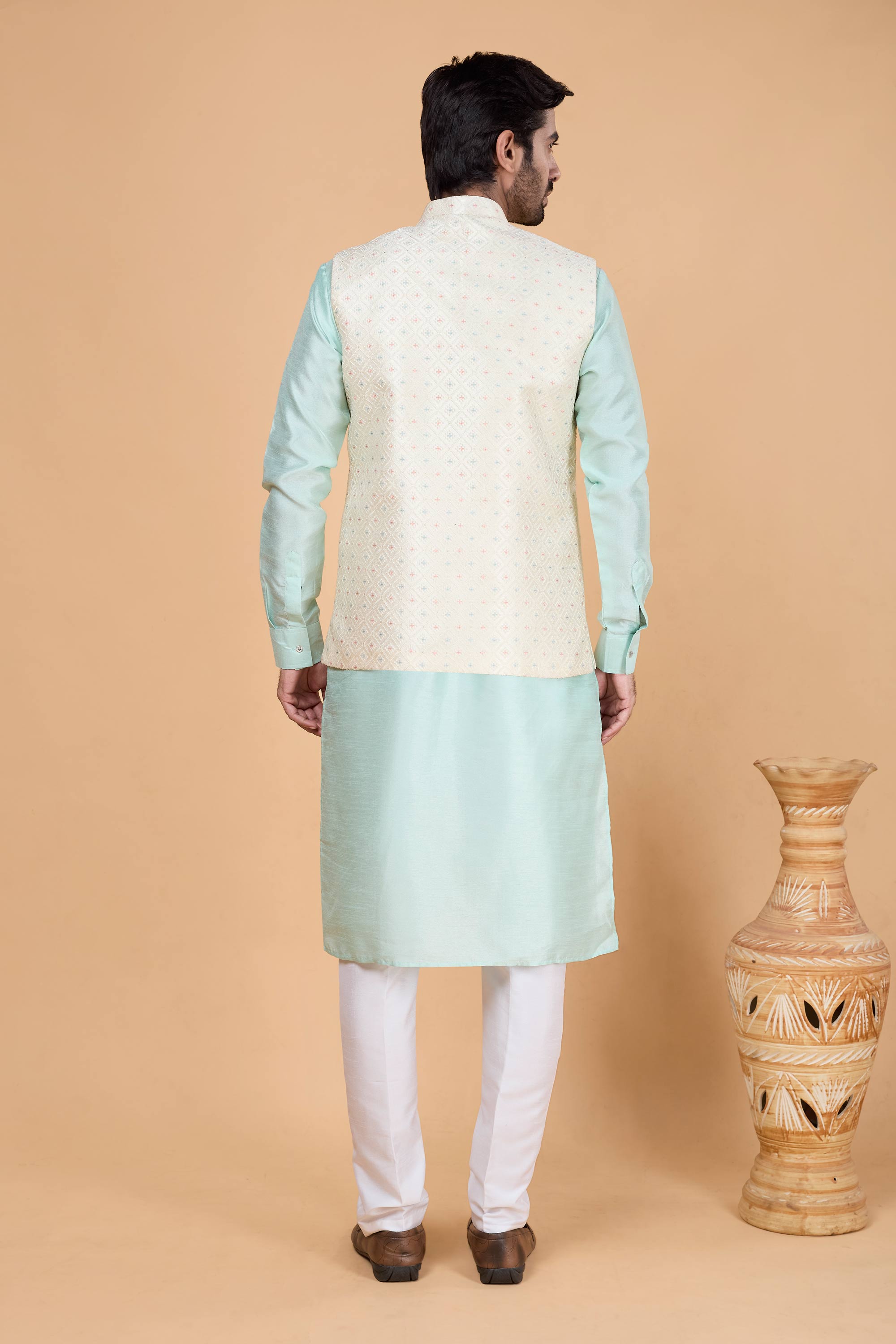 Step into timeless elegance with the Lovely Reach Color Wedding Function Designer Readymade Mens 3-Piece Kurta and Jacket with Aligadhi Pant. Designed for festive occasions and weddings, this premium outfit combines tradition with modern style. The high-quality fabric ensures comfort throughout your celebrations, while the detailed tailoring adds sophistication to your overall look. The ensemble includes a ready-to-wear kurta, an intricately designed jacket, and matching Aligadhi pants, offering a complete attire solution in one package. Ideal for groomsmen, wedding guests, or special festive gatherings, this versatile design stands out for its exquisite finish and vibrant color choices. Experience effortless style today.