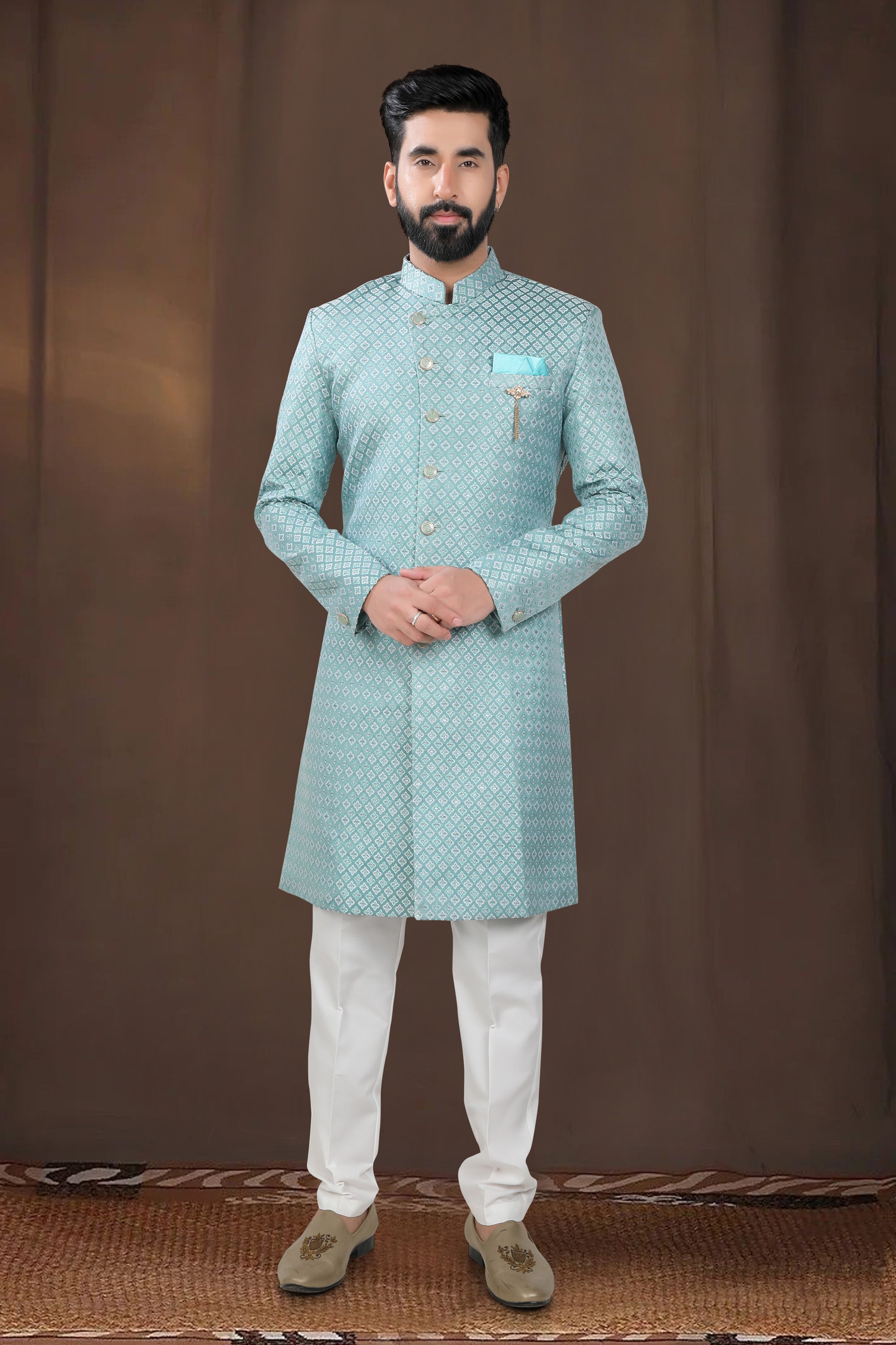 Jacquard Wedding Wear Attractive Readymade Men Indo Western In Green Color