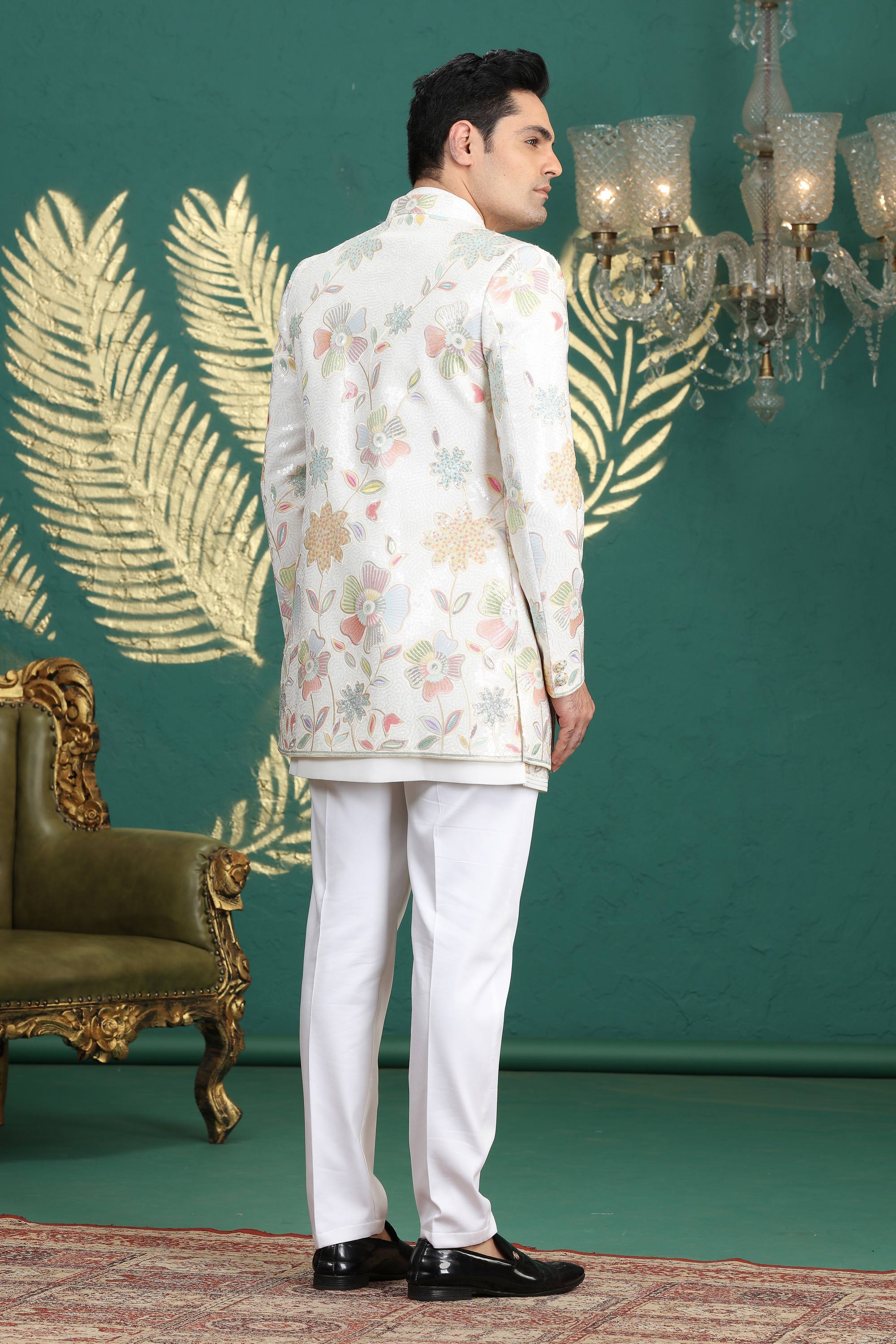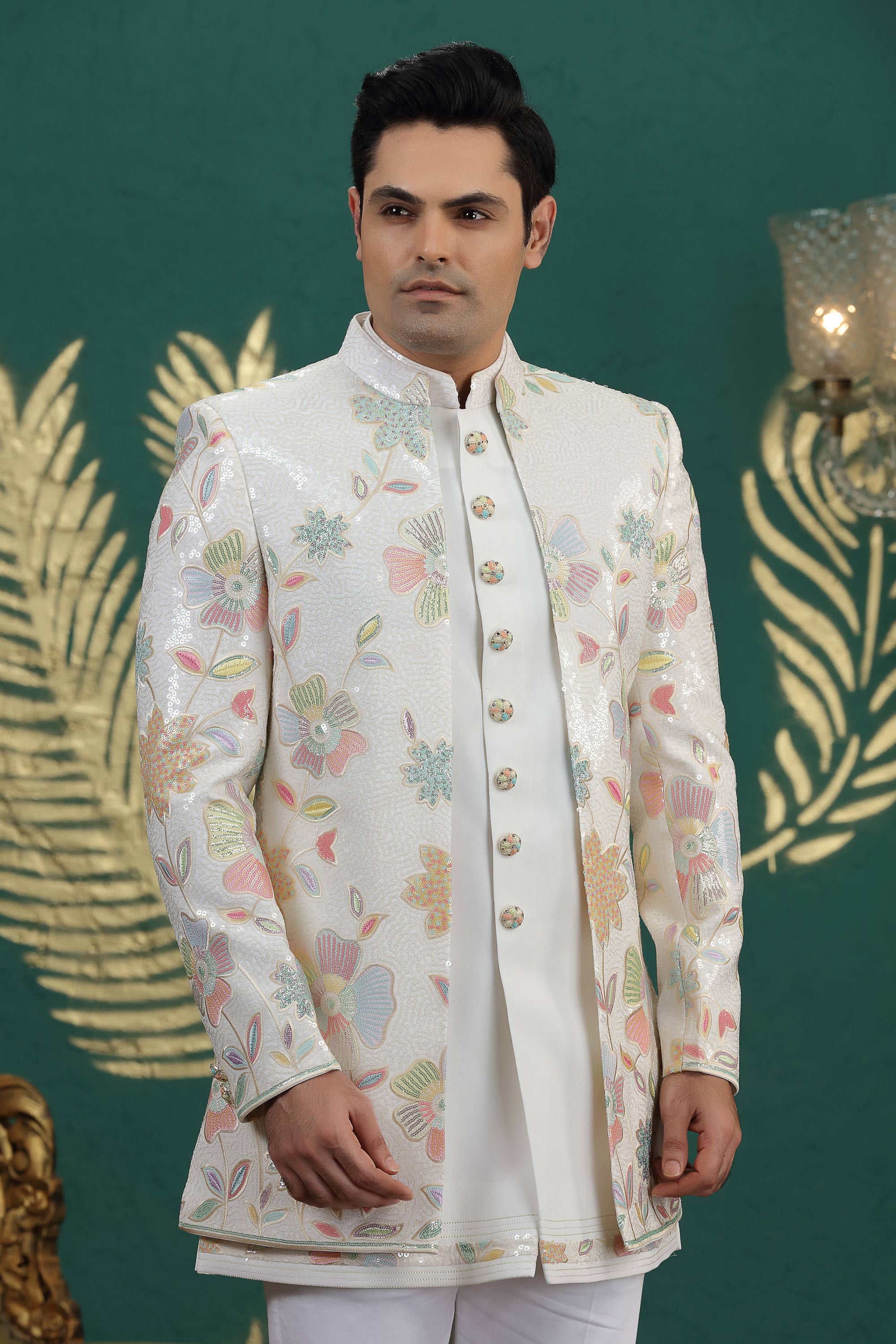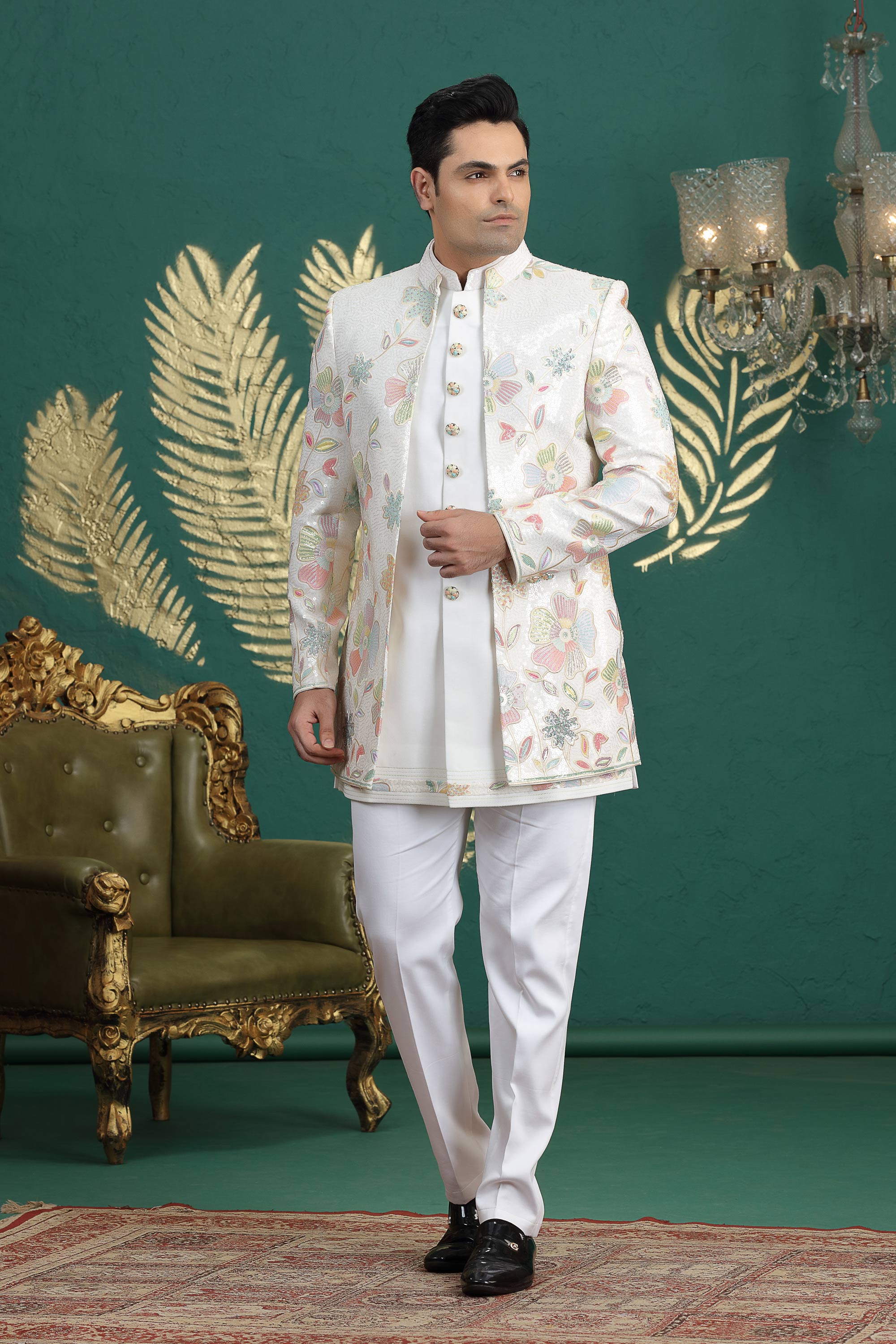 Off White Wedding Wear Art Silk 3 Piece Indo Western For Men