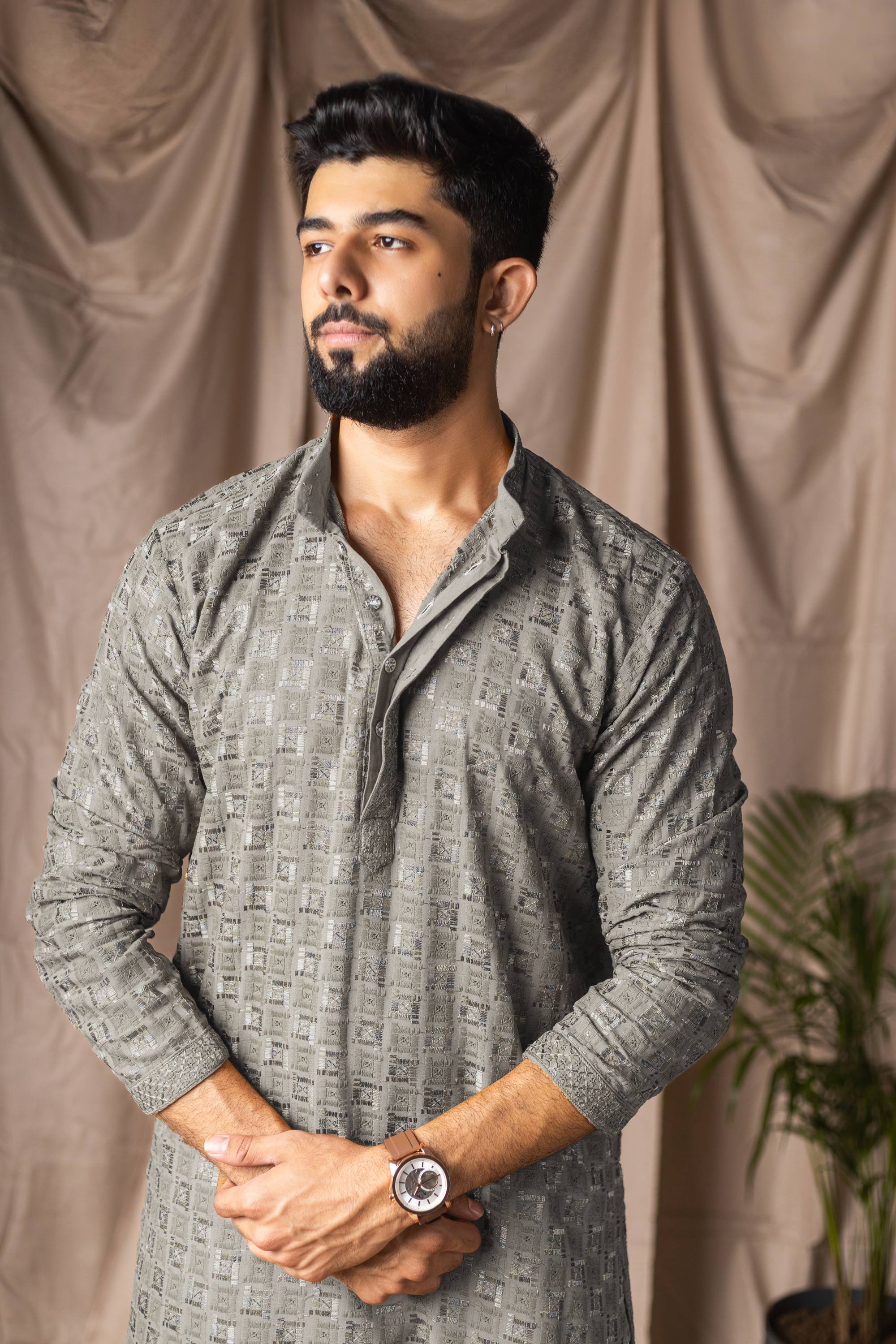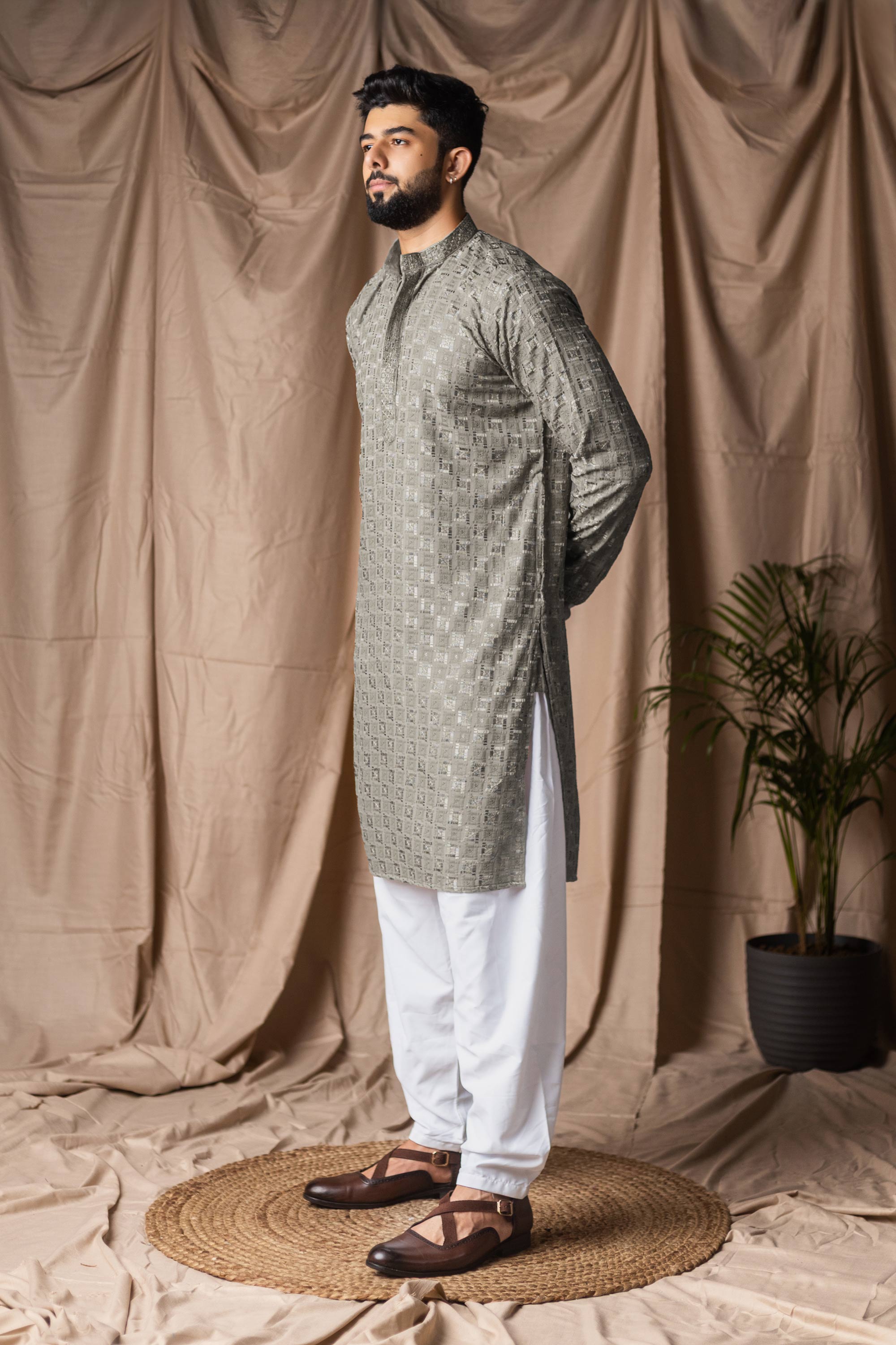 Viscose Rayon Grey Wedding Wear Readymade Kurta Pyjama For Men