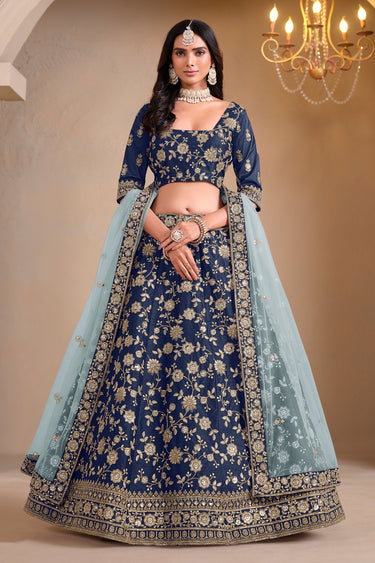 Embroidered Art Silk Fabric Navy Blue Color Sangeet Wear Lehenga Choli