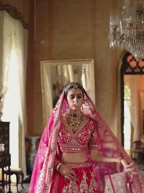 Step into elegance with this beautifully designed bridal lehenga. Crafted with intricate embroidery and detailed patterns, it radiates charm and grace for your special day. The blouse is tailored to complement the lehenga perfectly, offering both comfort and style. Whether it's for a traditional ceremony or an evening celebration, this ensemble promises to turn heads and make lasting impressions. Available in various sizes and designed for a perfect fit, this outfit is made to bring sophistication to every bride.