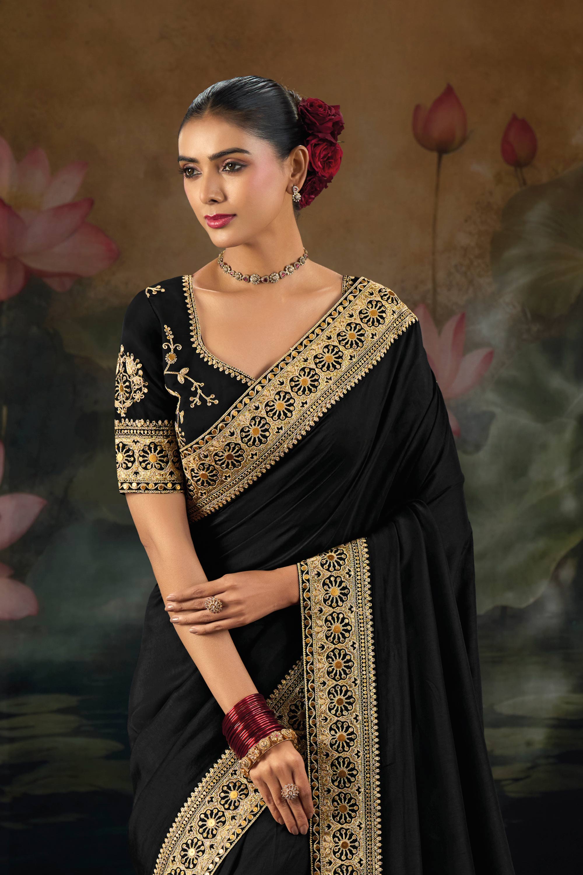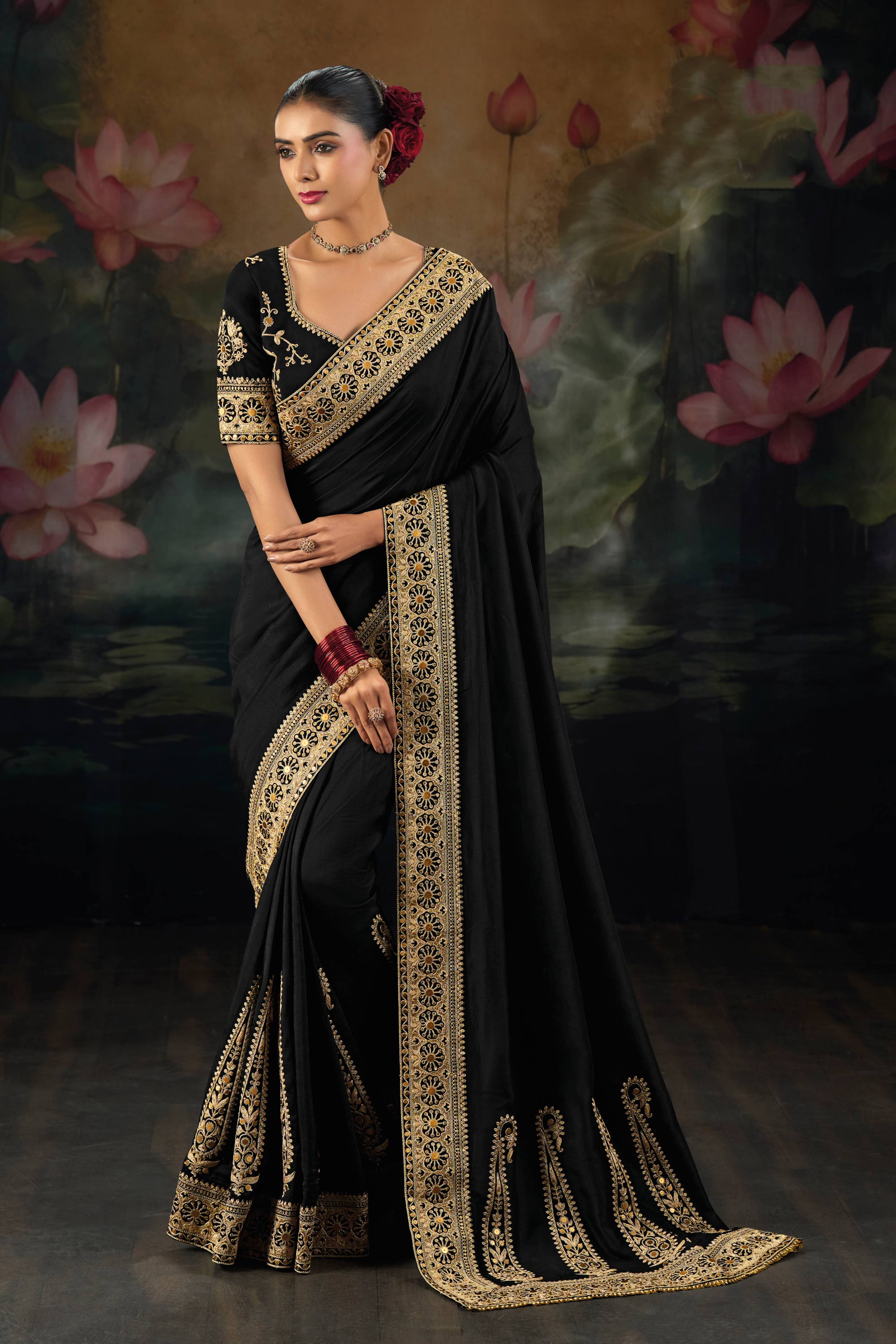 Black Sangeet Wear Silk Fabric Embroidered Saree