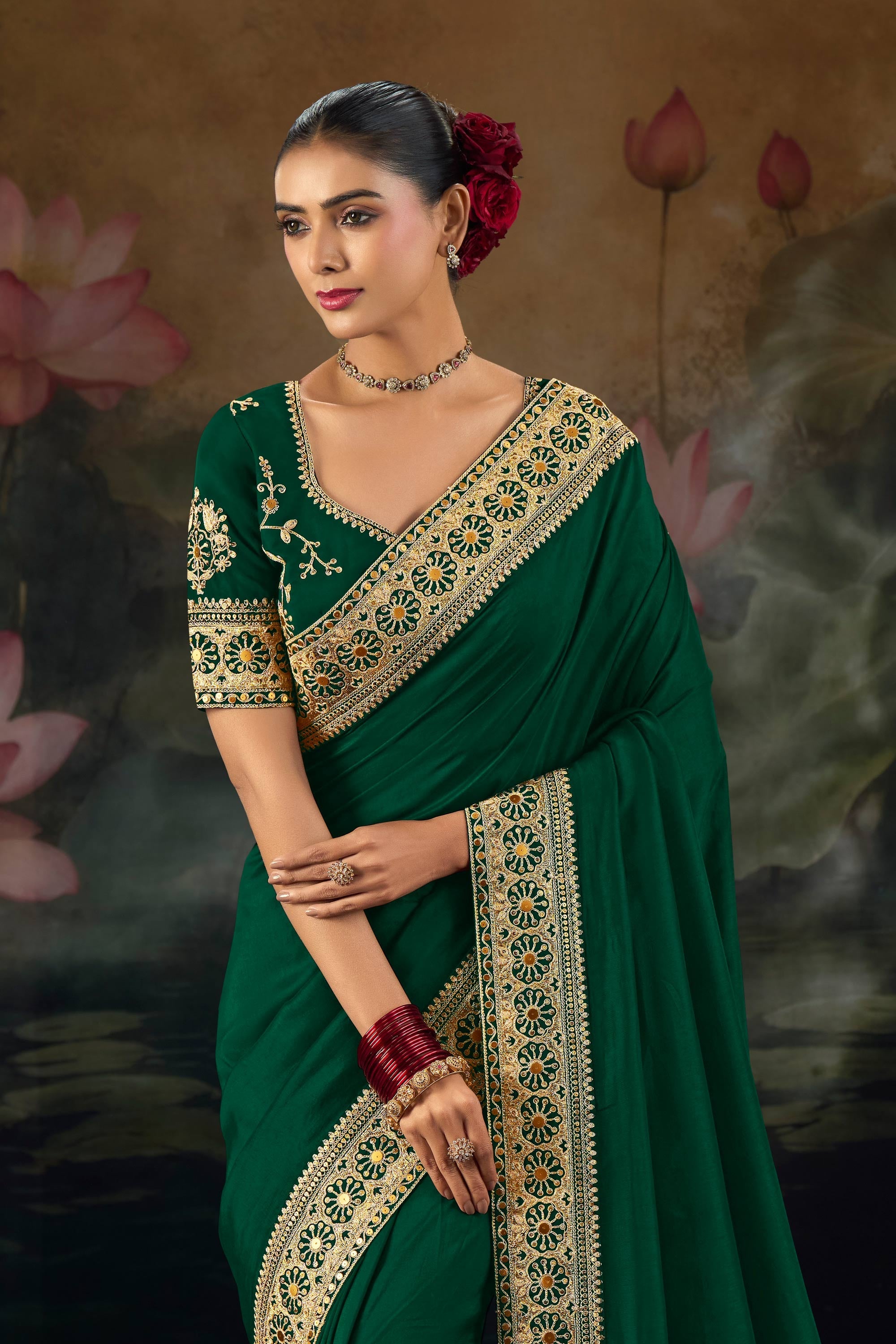 Dark Green Sangeet Wear Silk Fabric Embroidered Saree
