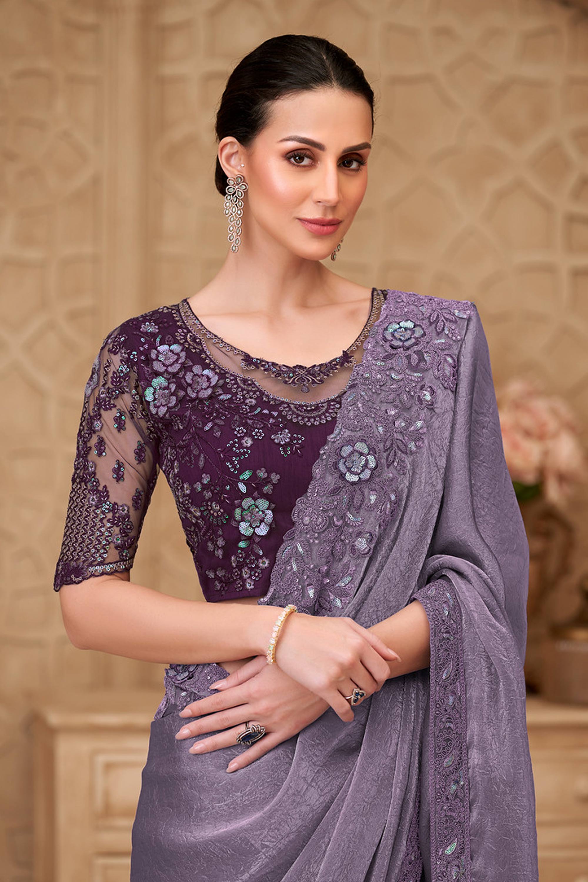 Embroidered Georgette Satin Purple Saree For Festive Wear