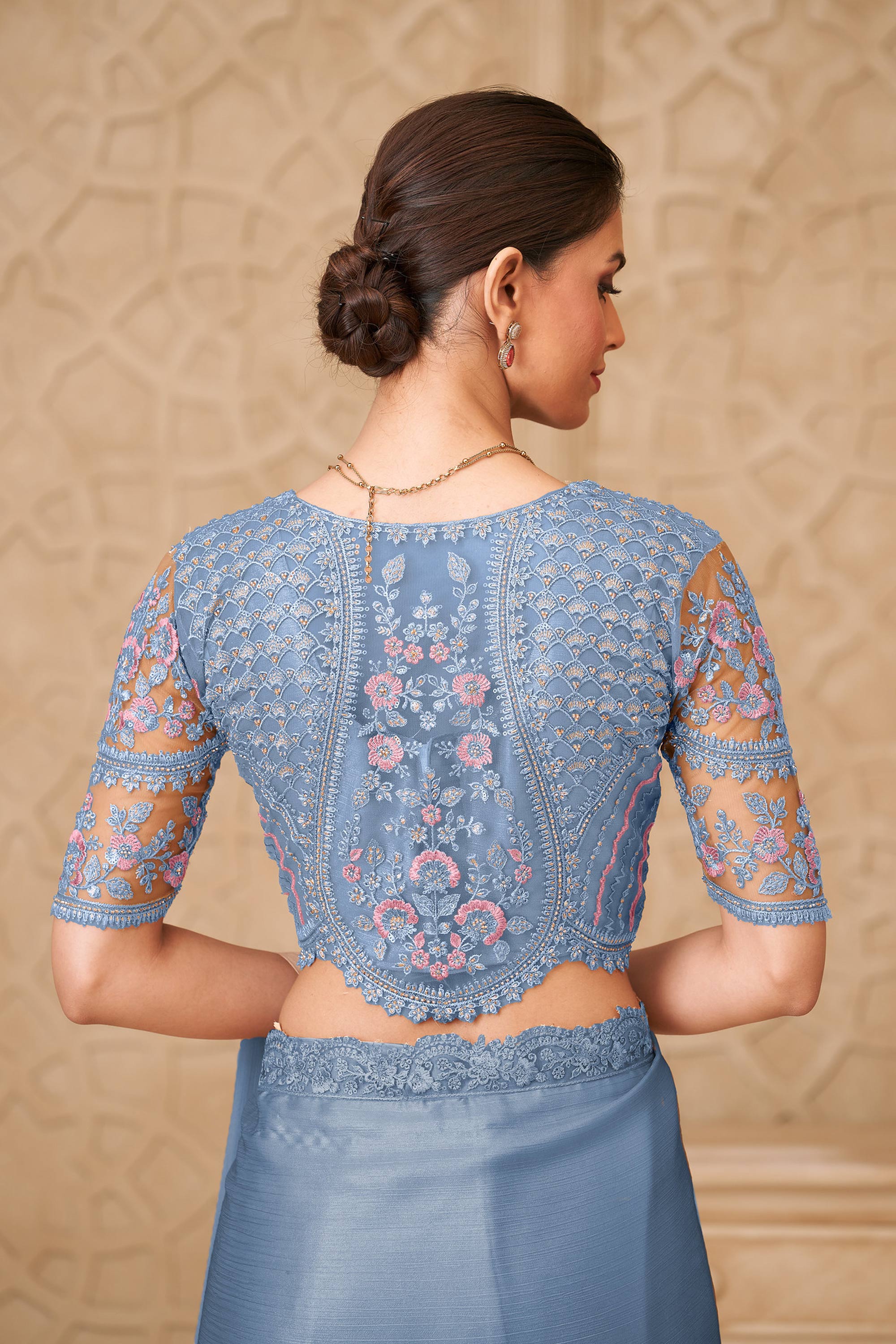 Lace Border Work Georgette Satin Sky Blue Wedding Wear Saree