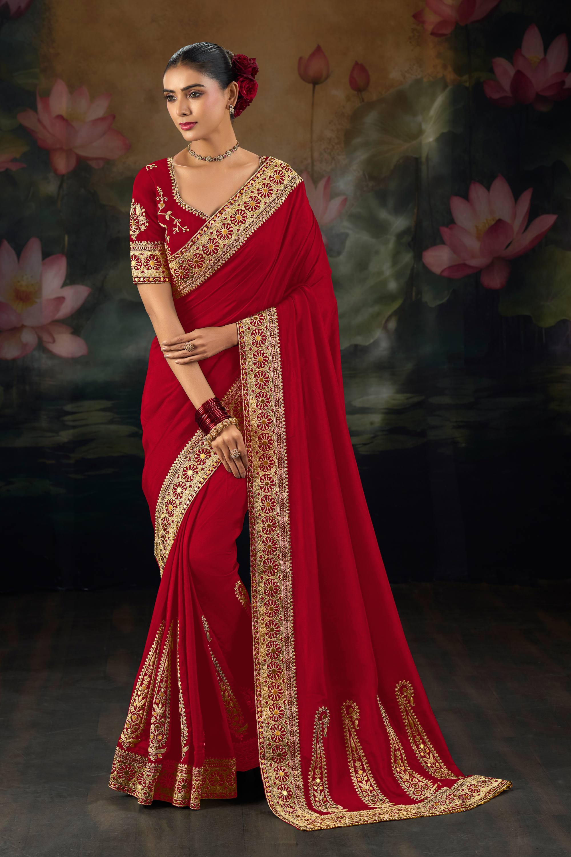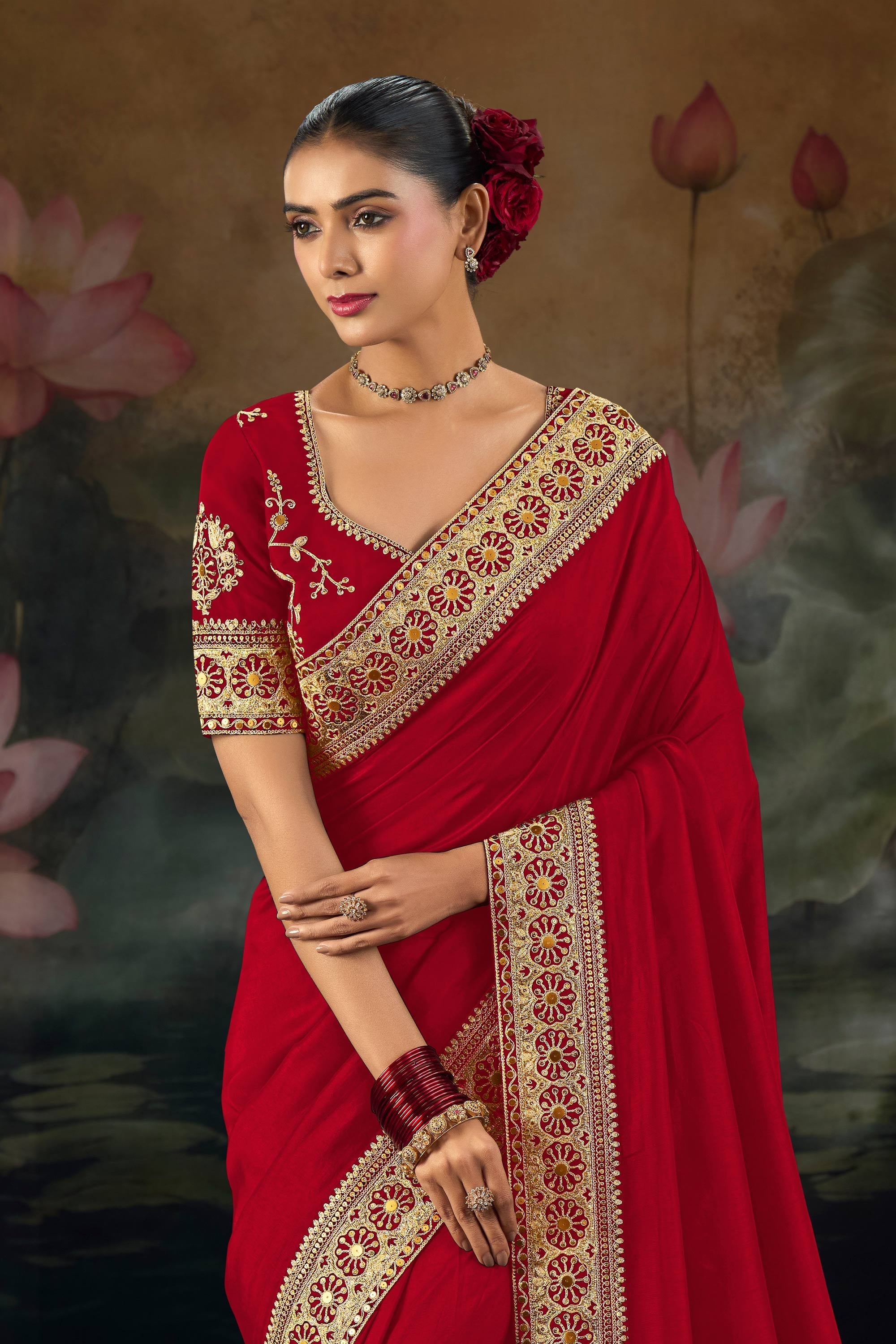 Red Sangeet Wear Silk Fabric Embroidered Saree