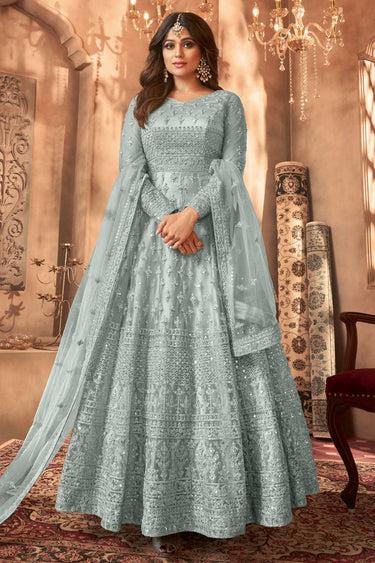 Shamita Shetty Grey Net Party Wear Anarkali Suit