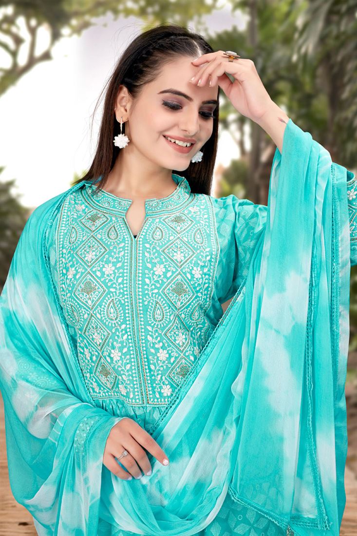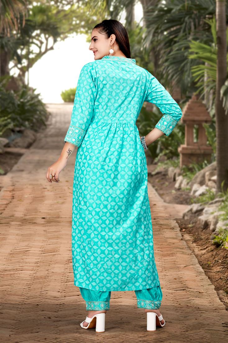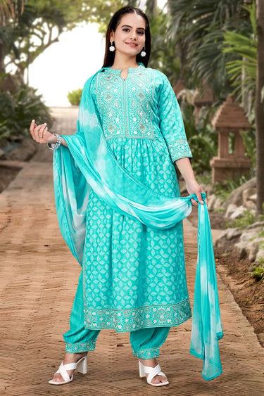 Afghani Style Beautiful Cyan Color Salwar Suit In Rayon Fabric