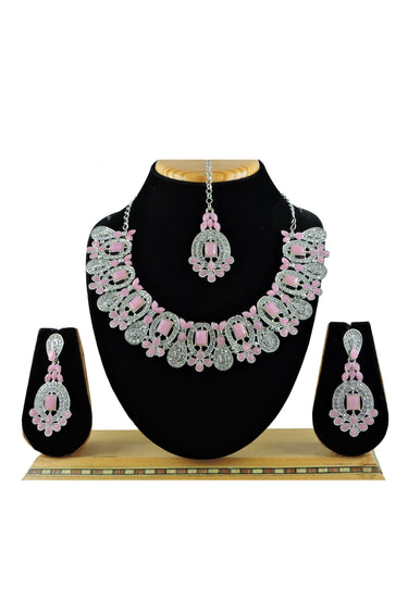 Alloy Material Pink Color Festive Wear Stylish Necklace Set With Earrings And Mang Tikka