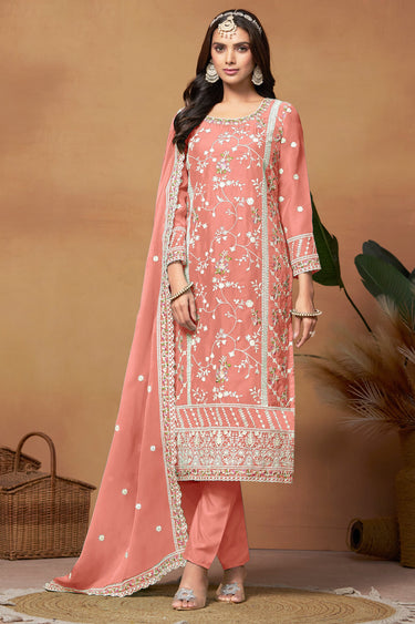 Alluring Organza Fabric Peach Color Embroidered Salwar Suit