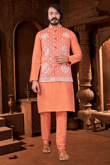 Alluring Peach Color Art Silk Fabric Sangeet Wear Readymade Kurta Pyjama With Trendy Jacket