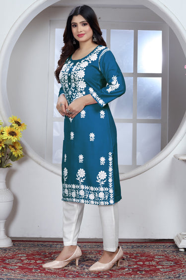 Appealing Blue Color Rayon Fabric Chikankari Embroidered Kurti With Bottom