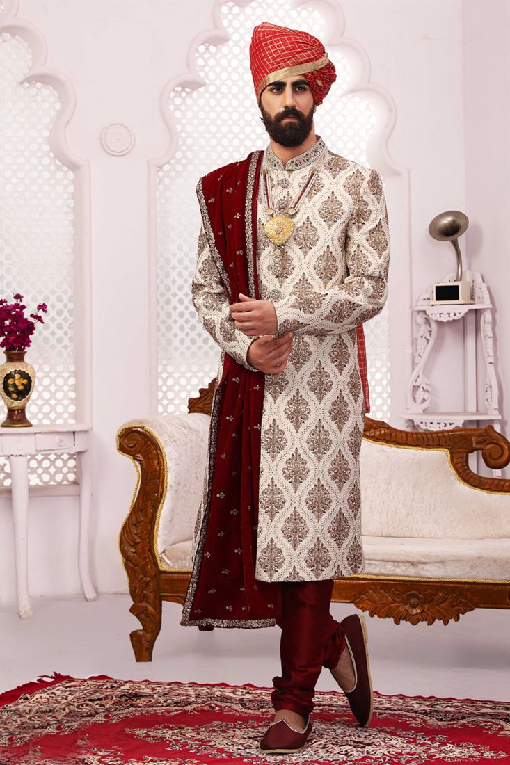 Appealing Off White Color Banarasi Silk Fabric Heavy Embroidered Designer Groom Sherwani