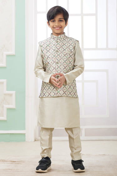Art Silk Beige Occasion Wear Readymade Boys Kurta Pyjama With Designer Jacket