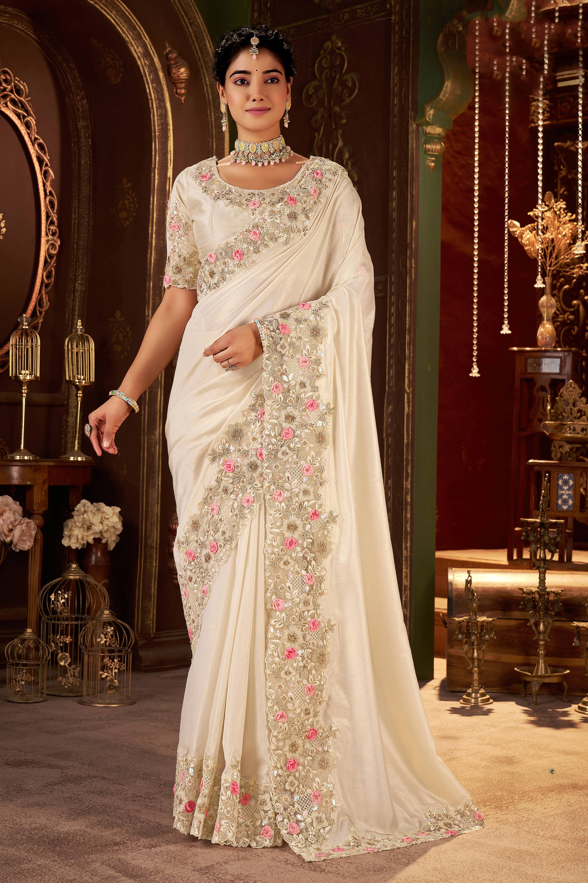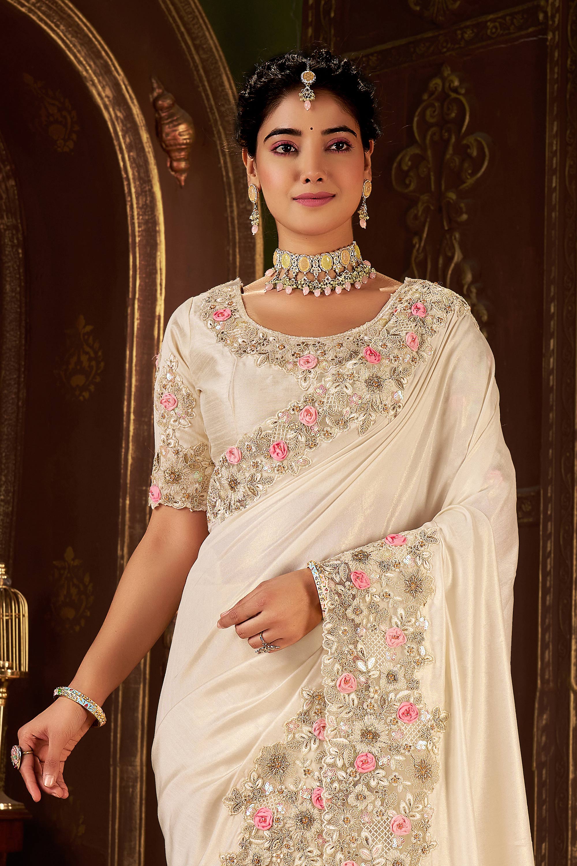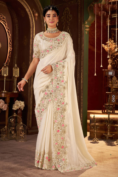 Art Silk Embroidered Border Work Beige Wedding Wear Saree