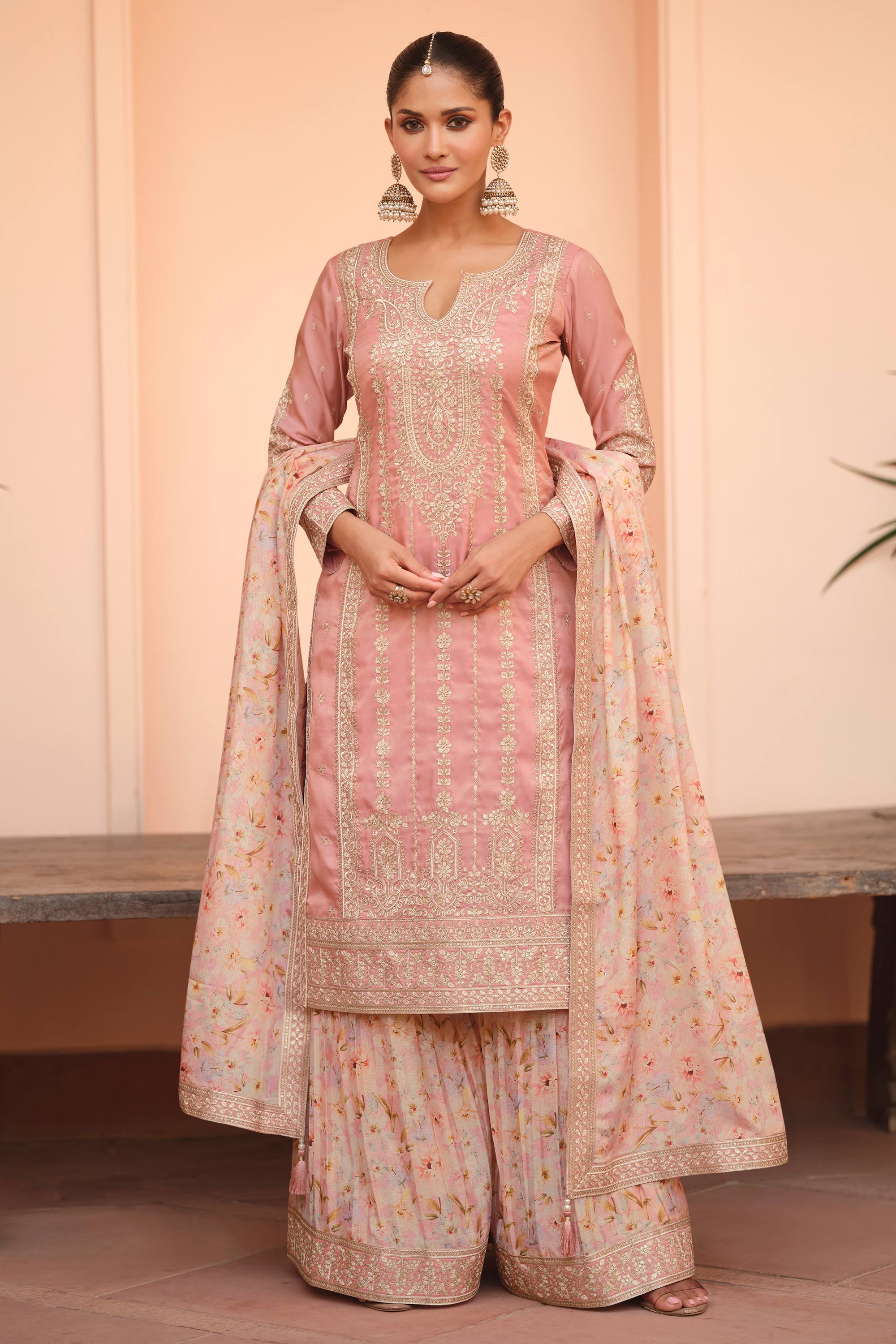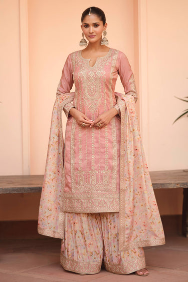 Art Silk Embroidered Peach Designer Sharara Style Palazzo Salwar Kameez