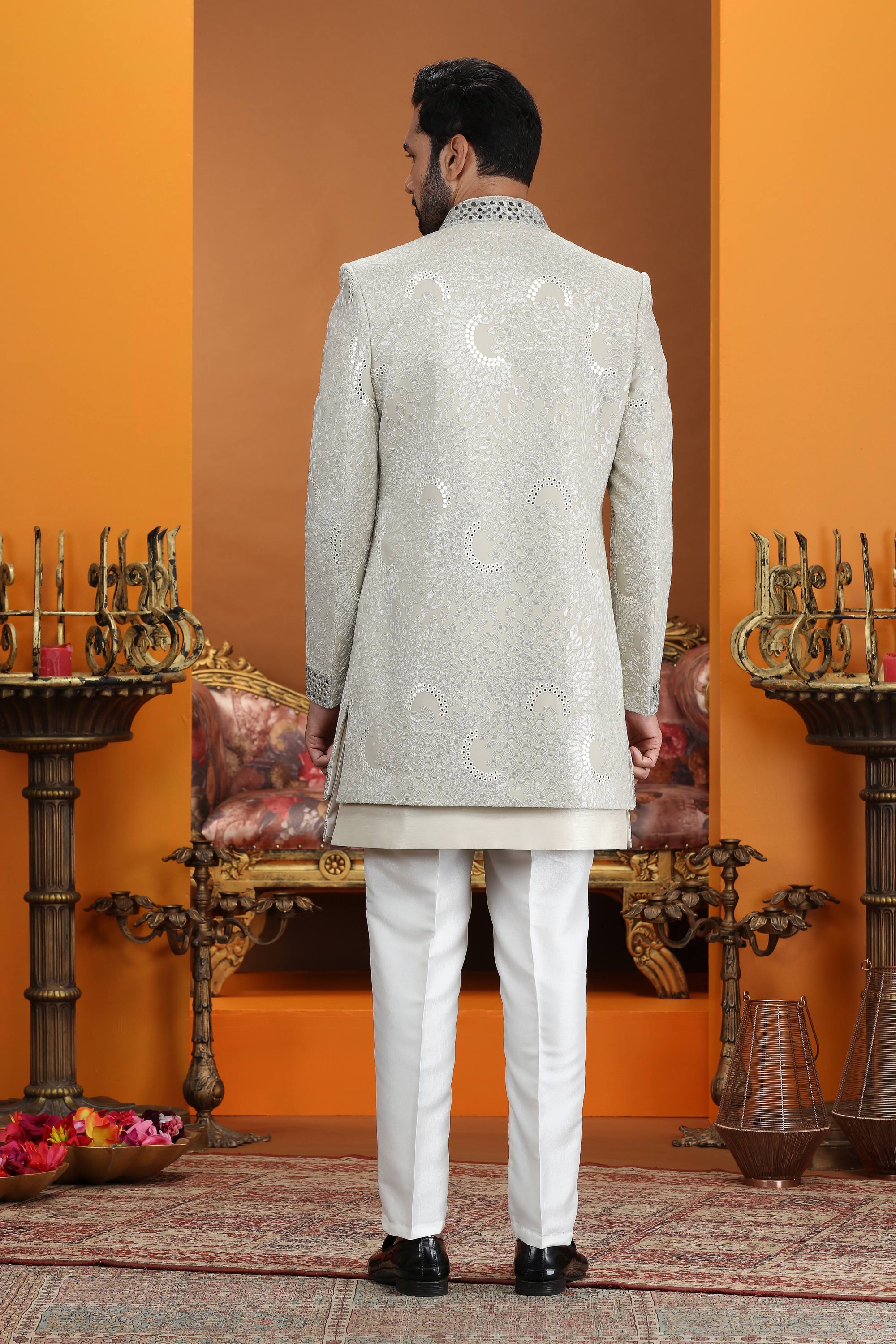 Upgrade your wedding look with this stylish Men Indo Western, designed to deliver a perfect blend of tradition and modern elegance. The top features computer thread embroidery work on premium art silk, giving the outfit a rich and refined appeal. Styled as a 3-piece jacket set, it adds a royal touch suitable for special occasions. Due to digital photography, slight color variations may occur.