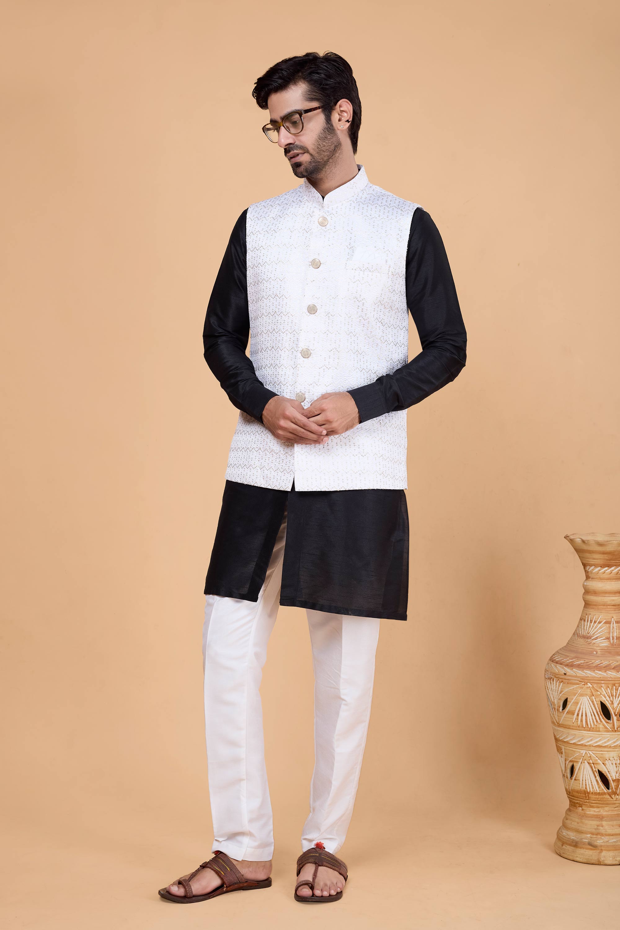 Complete your festive wardrobe with this elegant 3-piece ensemble featuring a ready-to-wear kurta, stylish jacket, and comfortable Aligadhi pants. Crafted from high-quality fabric, this outfit blends traditional style with modern tailoring for a sleek, contemporary fit. Ideal for weddings, family gatherings, or cultural celebrations, its vibrant color adds a touch of charm and sophistication. The pre-stitched design ensures ease and convenience, so you’re ready to shine effortlessly. Elevate your traditional look with this must-have addition to your ethnic collection.