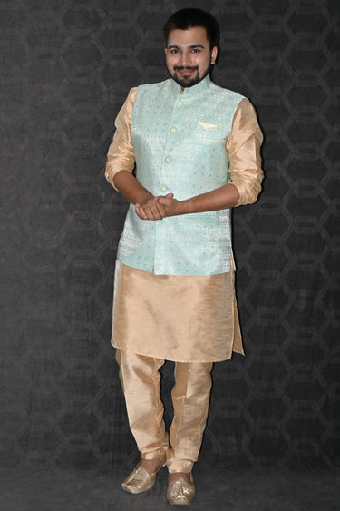 Deck yourself up in style for any grand occasion with our Art Silk Kurta Pyjama set for men. Rendered in a gleaming gold shade, the ensemble creates an aura of majestic charm. To make the outfit even more glamorous, we've included a finely designed three-piece jacket set. Perfectly readymade for your convenience, this outfit redefines the classic blend of elegance and convenience.