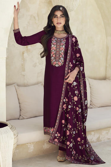 Art Silk Fabric Fancy Embroidered Function Wear Long Straight Cut Salwar Suit In Dark Magenta Color