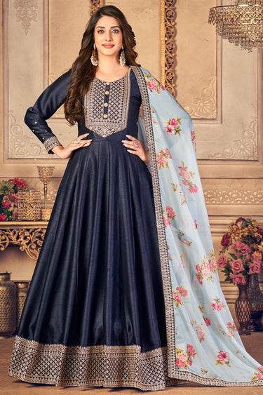Art Silk Fabric Festival Look Glorious Anarkali Suit In Navy Blue Color