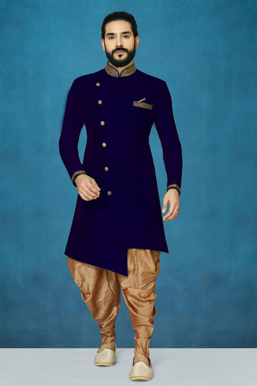 Art Silk Fabric Function Wear Stunning Dhoti Style Indo Western In Navy Blue Color