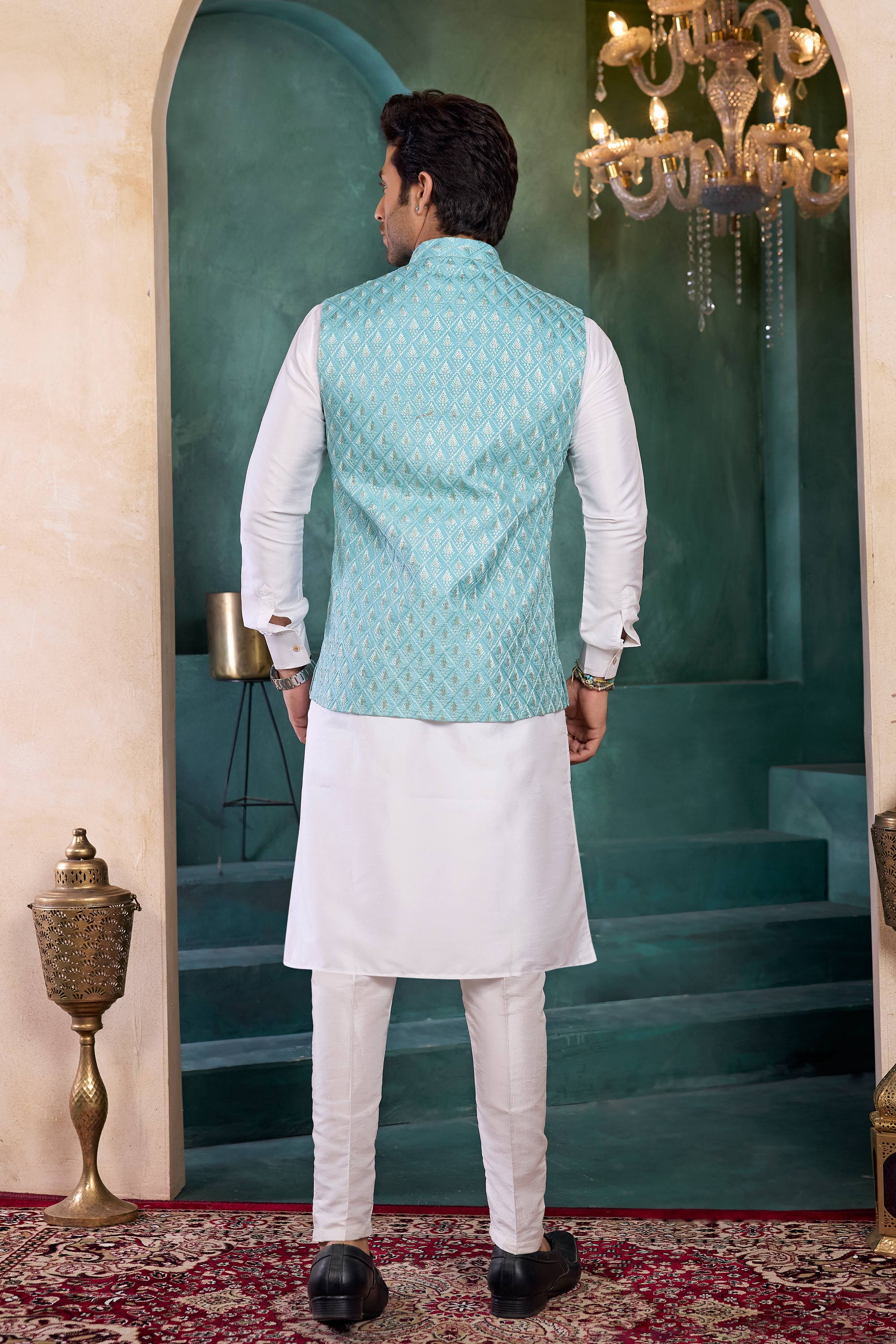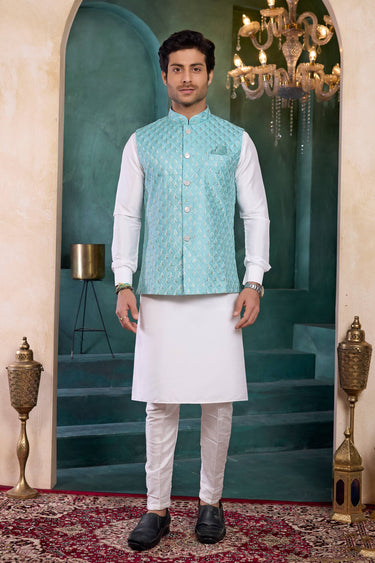 Stand out at every wedding or event with this Designer Readymade Mens 3-Piece Kurta, Jacket, and Aligadhi Pant ensemble. This ethnic set offers the perfect combination of sophistication and comfort. The kurtas refined cut complements the beautifully crafted jacket, while the Aligadhi pants provide a modern touch to the traditional look. Whether you're a groom, a guest, or part of a festive celebration, this attire guarantees youll feel confident and look impeccable. Lightweight and easy to maintain, its ideal for special occasions without compromising comfort. Make this timeless outfit a staple in your ethnic collection.